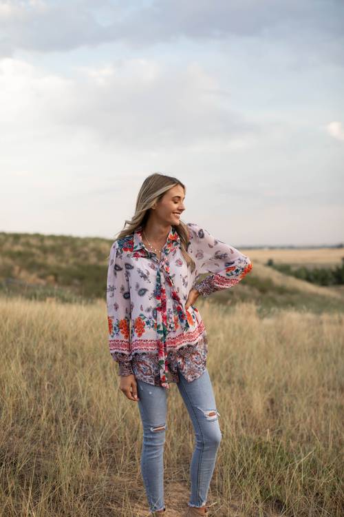 If you’re looking for a boho-inspired button-down piece, try this collared long-sleeved blouse. It has a breathable material, allowing you to move freely while not compromising on the style department. This flowy top goes perfect with your favorite pair of jeans, denim shorts, or mini skirts.