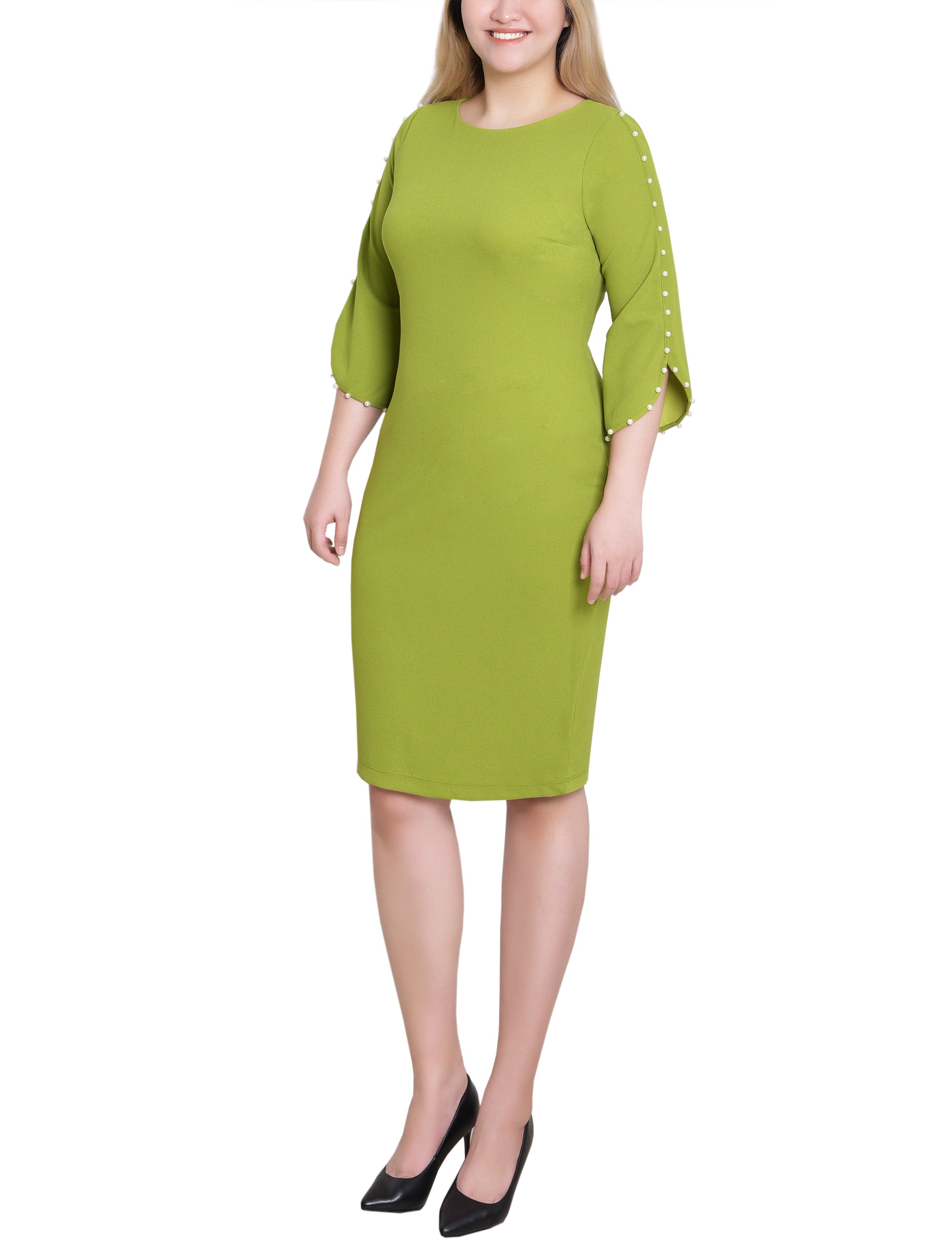 Green 3/4 Pearl-Detail Petal Sleeve Dress