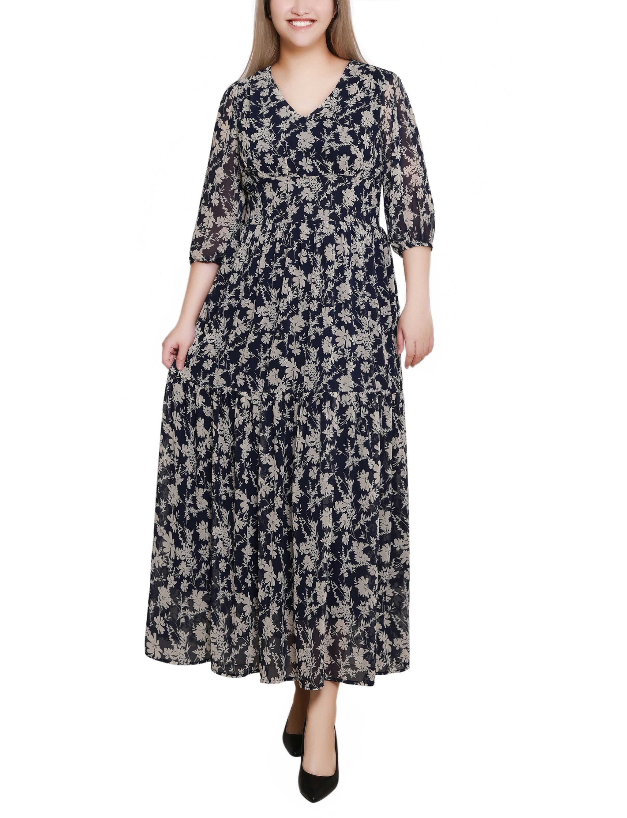 Navy White Floral Elbow Sleeve Tiered Midi Dress