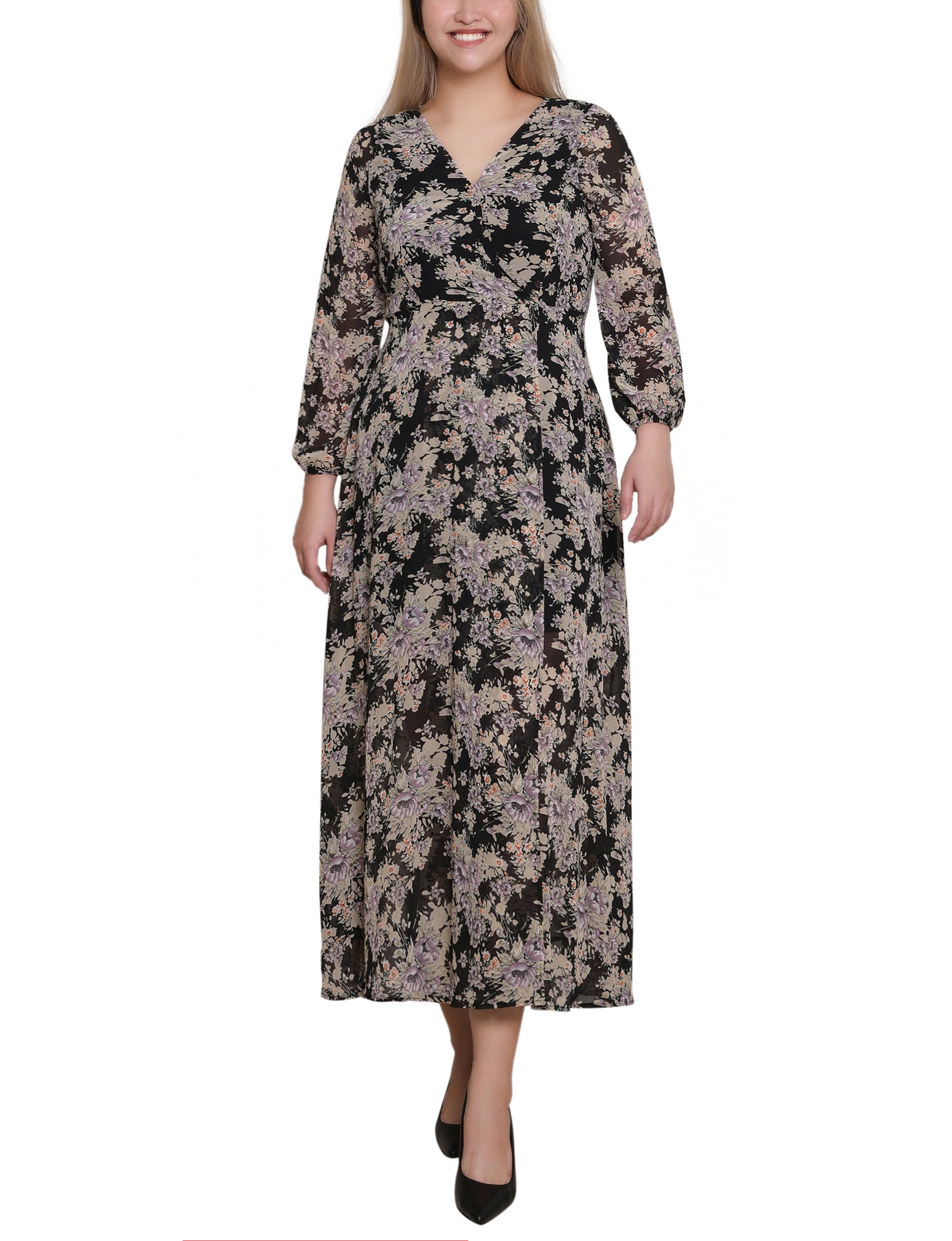 Black Ivory Floral 3/4 Sleeve Surplice Midi Dress