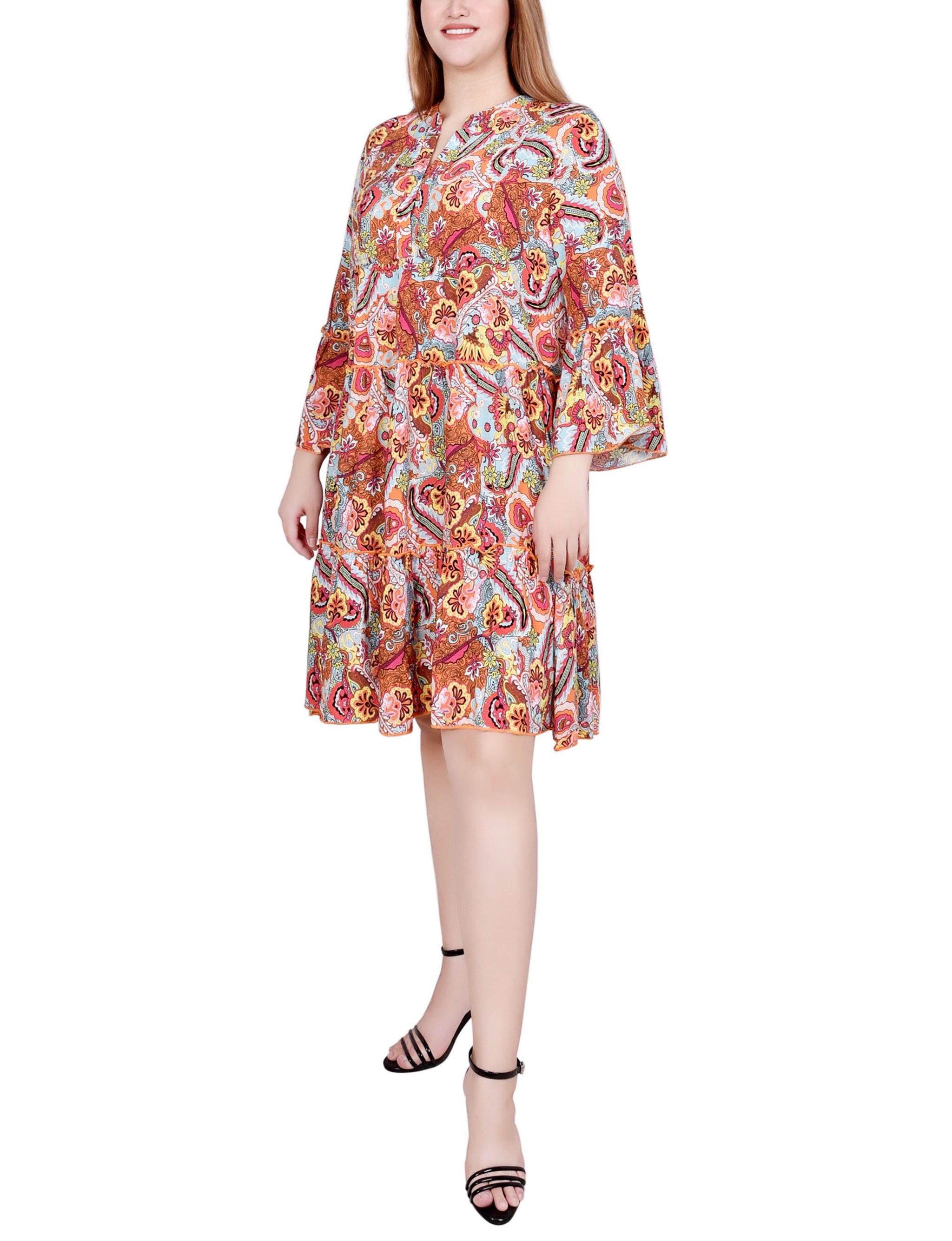 Blue Orange Floral Paisley 3/4 Sleeve Tiered Dress