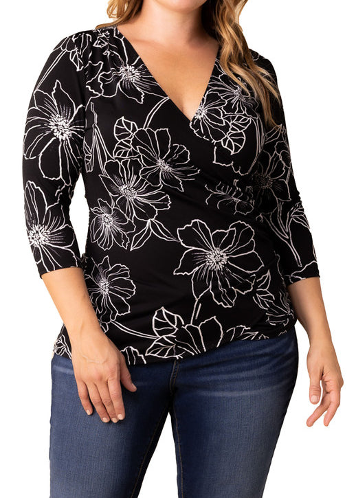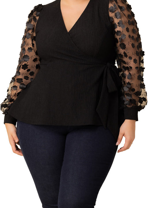 3/4 Ruffle Sleeve V-Neck Blouse - Black - Plus