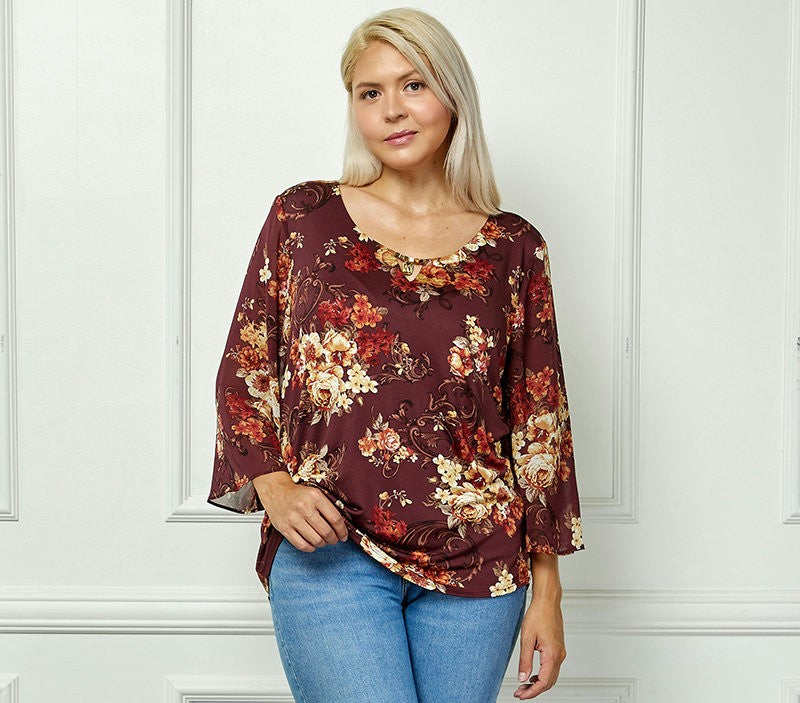 Vintage Rose 3/4 Flare Sleeve Cutout Trim Mix Media Blouse in Burgundy - Plus