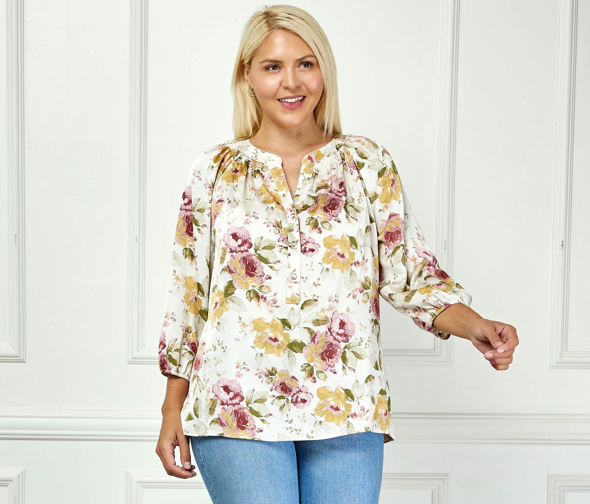 3/4 Sleeve Mandarin Collar Popover Blouse - Plus
