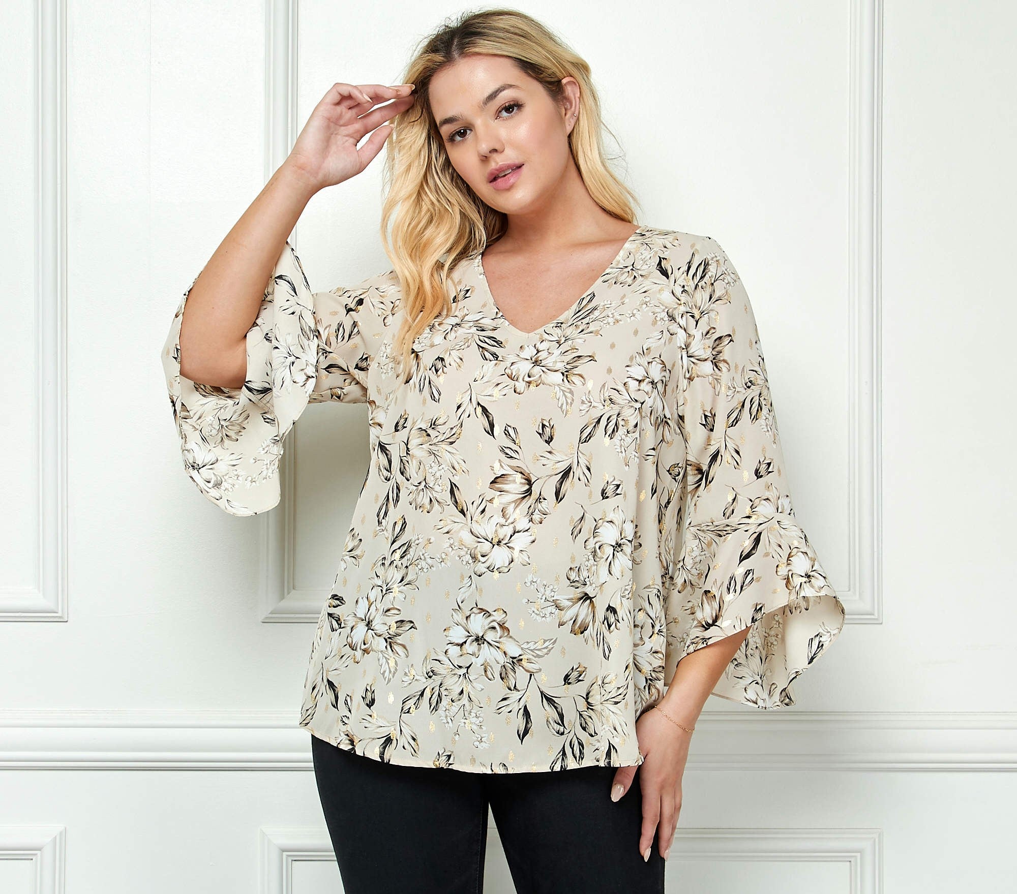 3/4 Ruffle Sleeve V-Neck Dash Foil Print Blouse in Beige - Plus