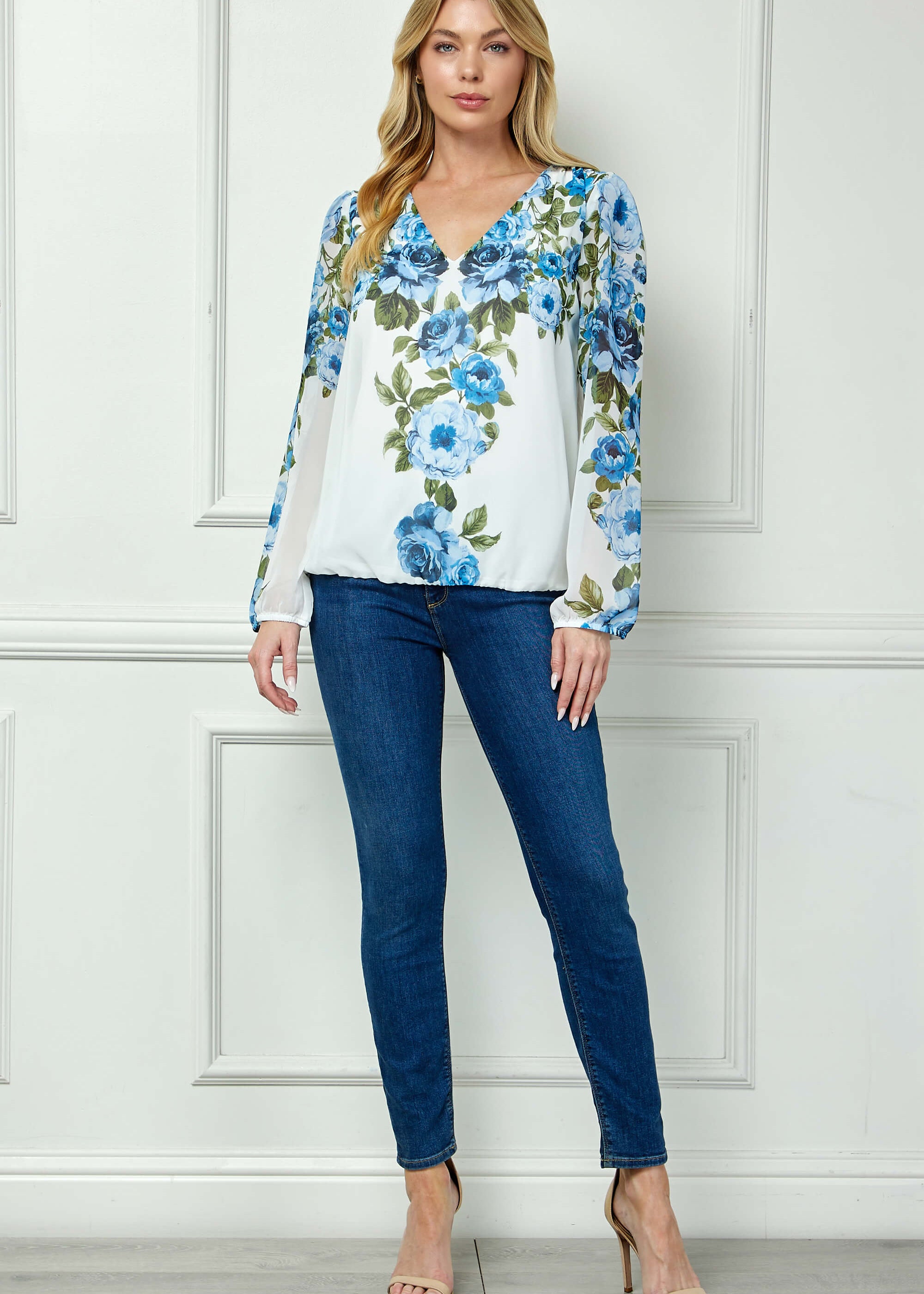 Long Elastic Cuff Sleeve V-Neck Placement Print Bubble Blouse