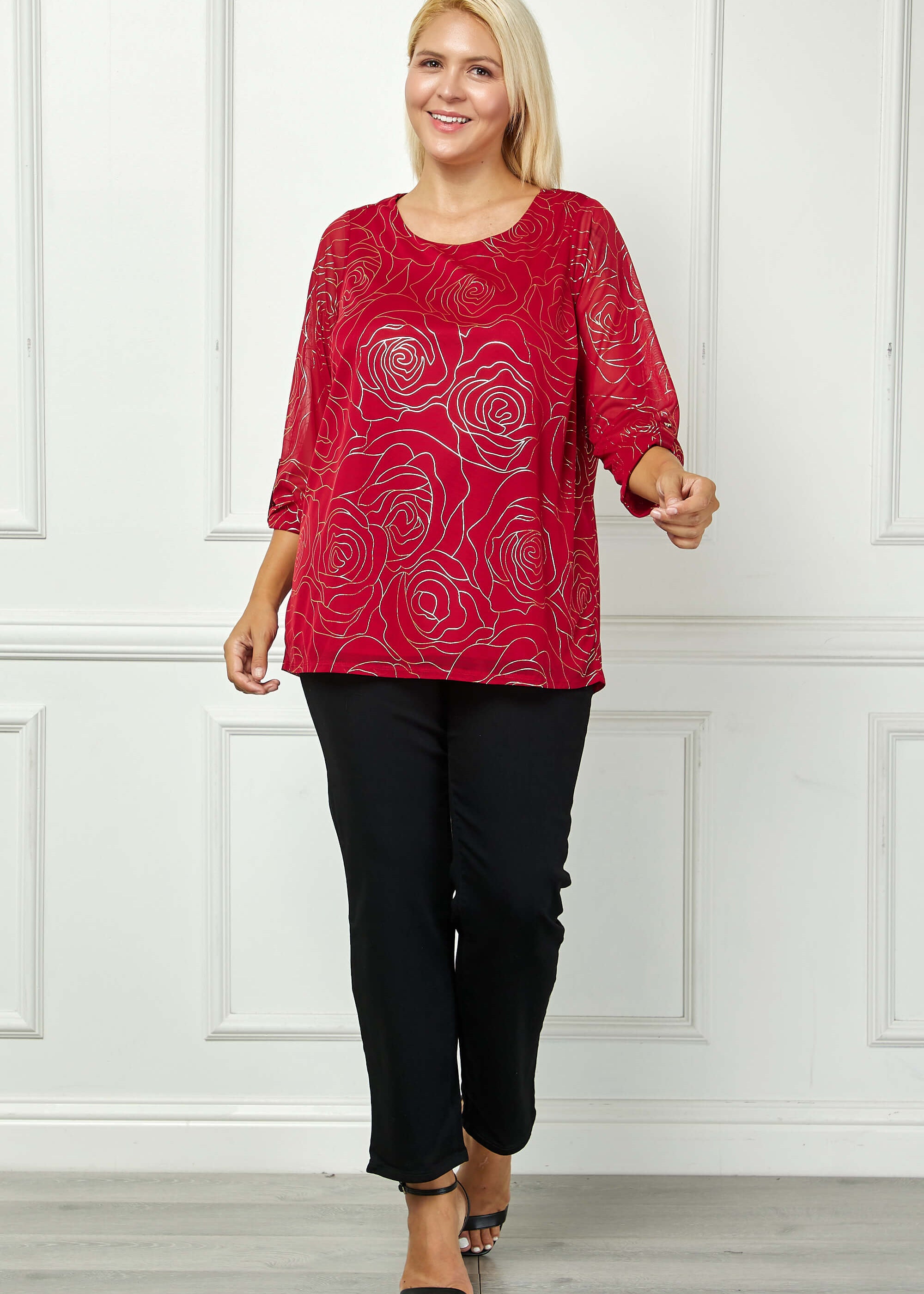3/4 Button Tab Sleeve Scoop Neck Foil Blouse in Red - Plus