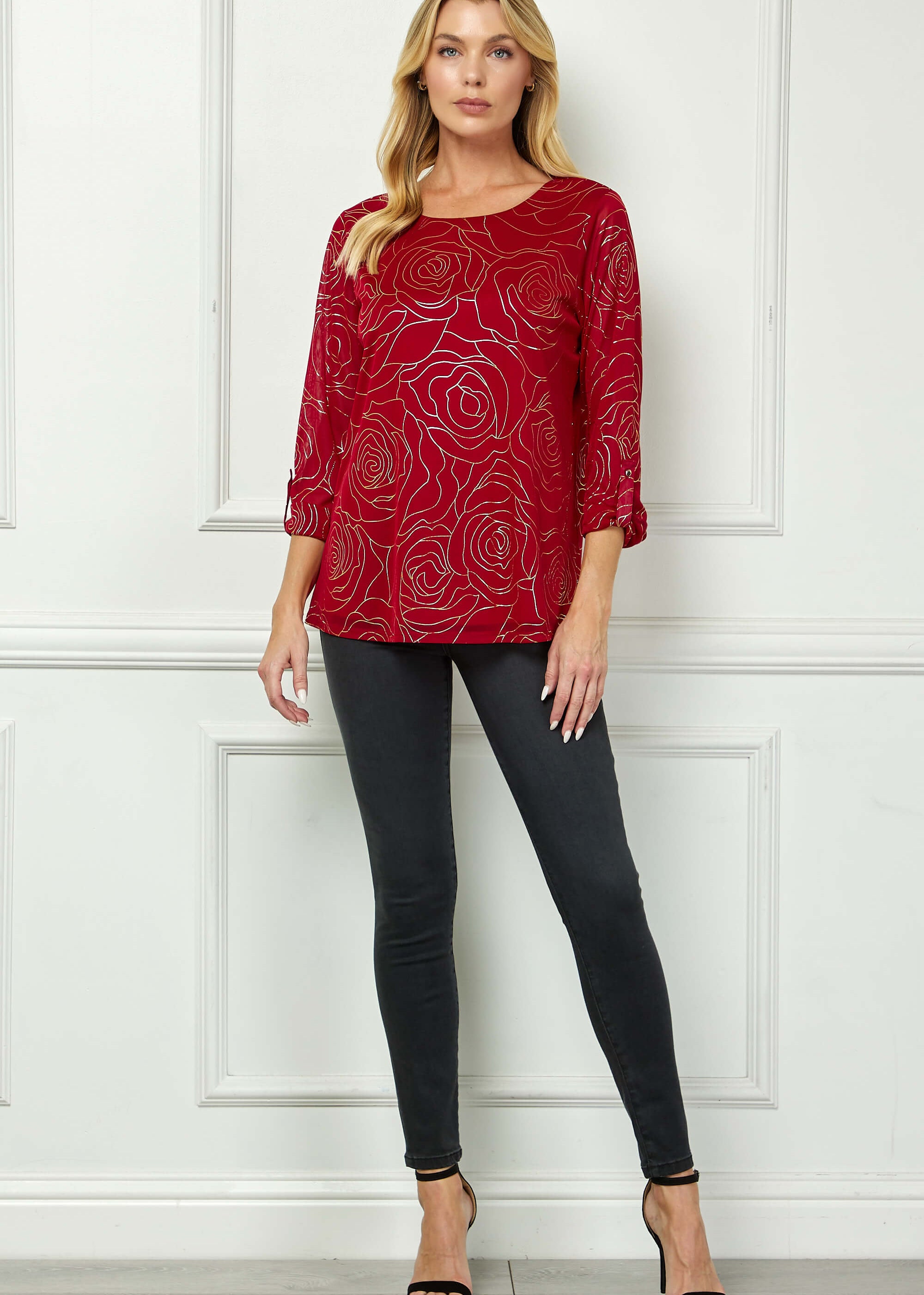 3/4 Button Tab Sleeve Scoop Neck Foil Blouse in Red