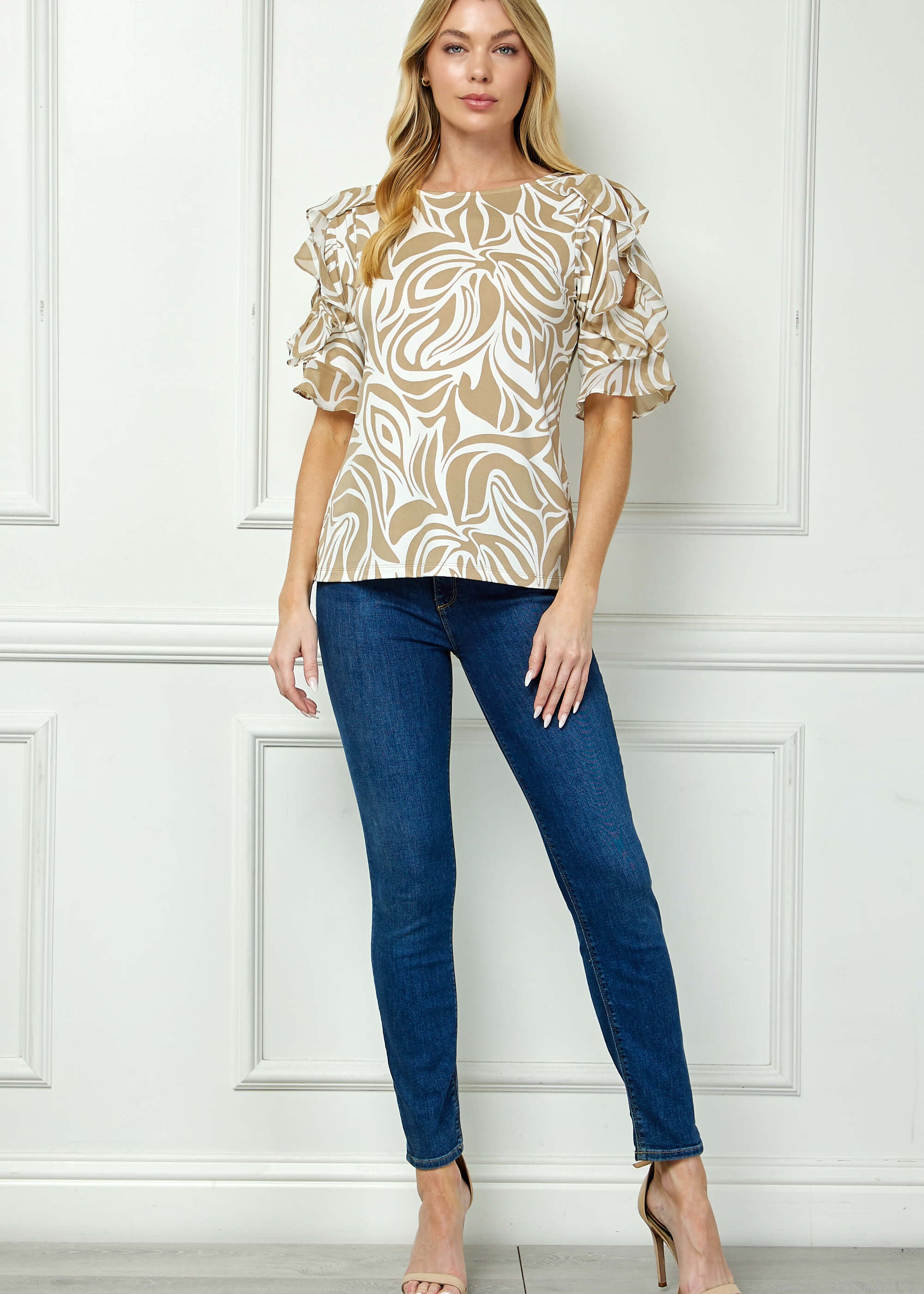 Ruffle Cold Shoulder Scoop Neck Blouse - Beige