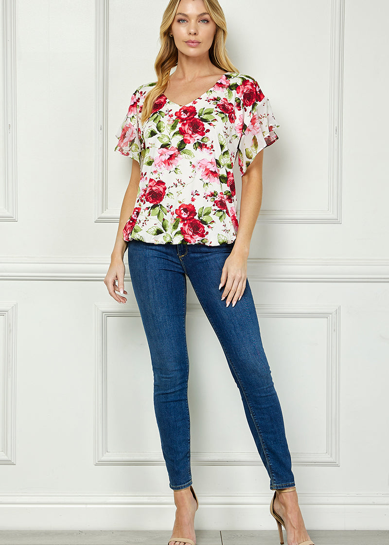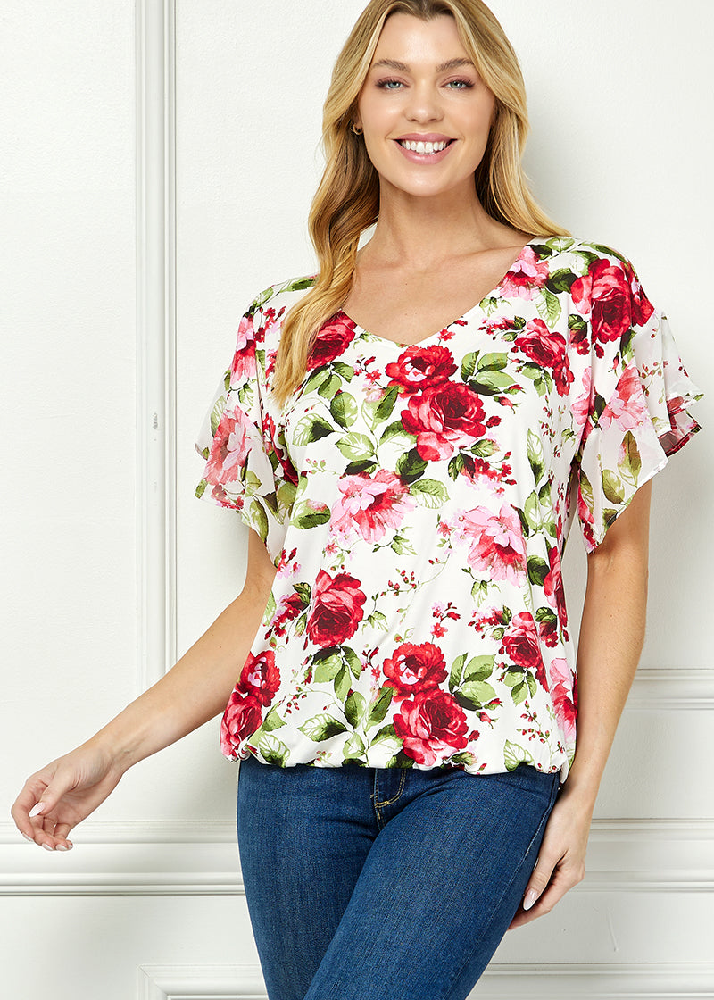 Ruffle Cold Shoulder V-Neck Blouse - Ivory/Red