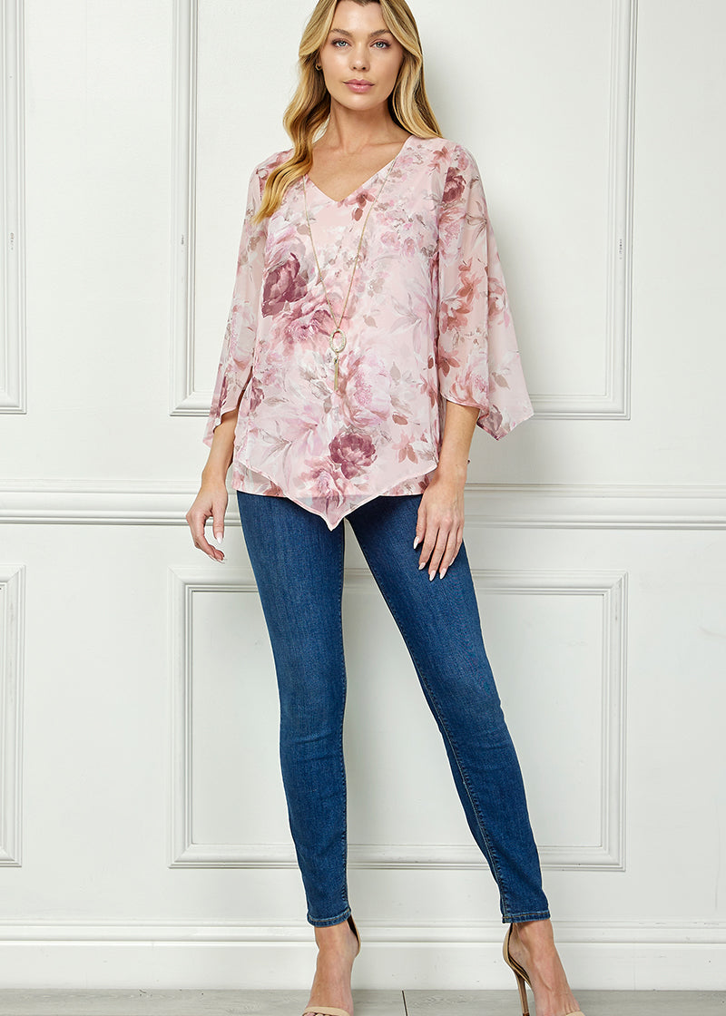 Hanky Hem Poncho V-Neck Blouse with Necklace - Plus - Pink