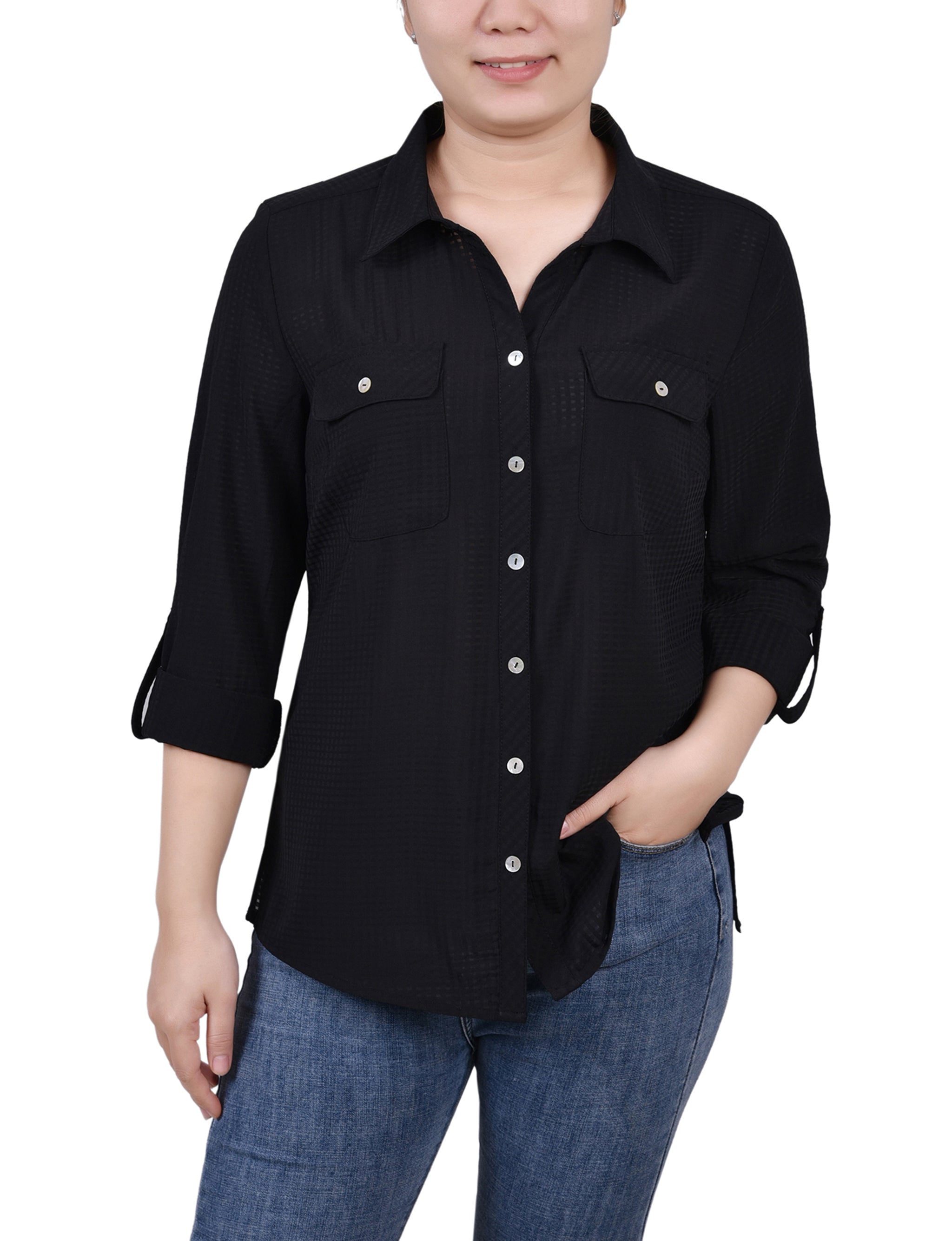 Black White Justin 3/4 Roll Tab Blouse With Pockets - Plus Size