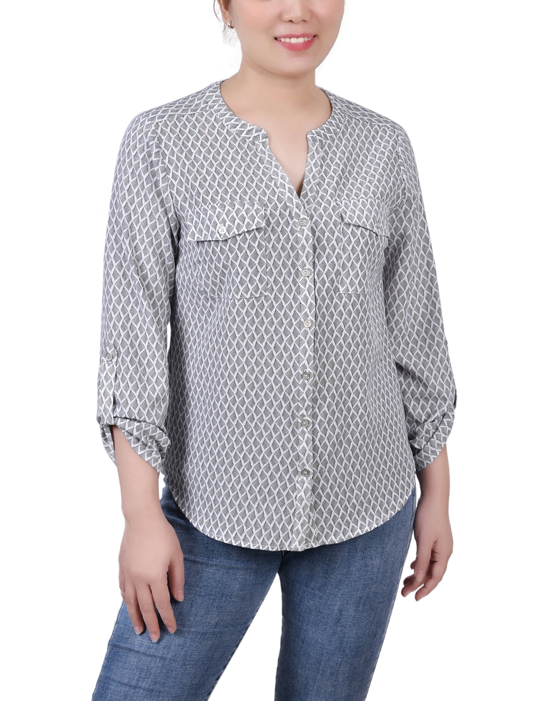 Black White Abstract 3/4 Roll Tab Sleeve Mandarin Collar Blouse - Petite