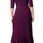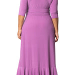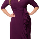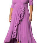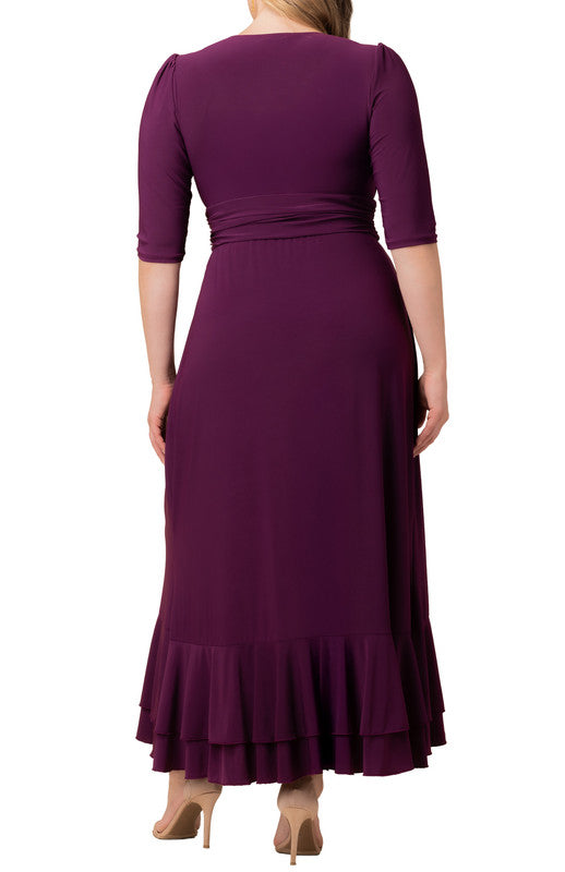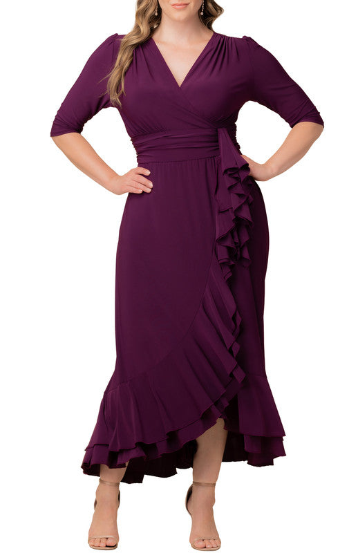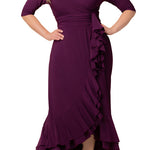 The Veronica Ruffled Evening Gown is an elegant long dress with a faux wrap design, slim 3/4 sleeves, a surplice neckline, and a ruched waistband. The gracefully sweeping skirt features ruffle details from the front waistband down through the hem to complete the look.