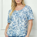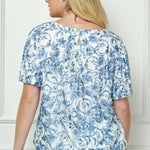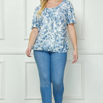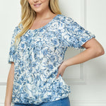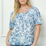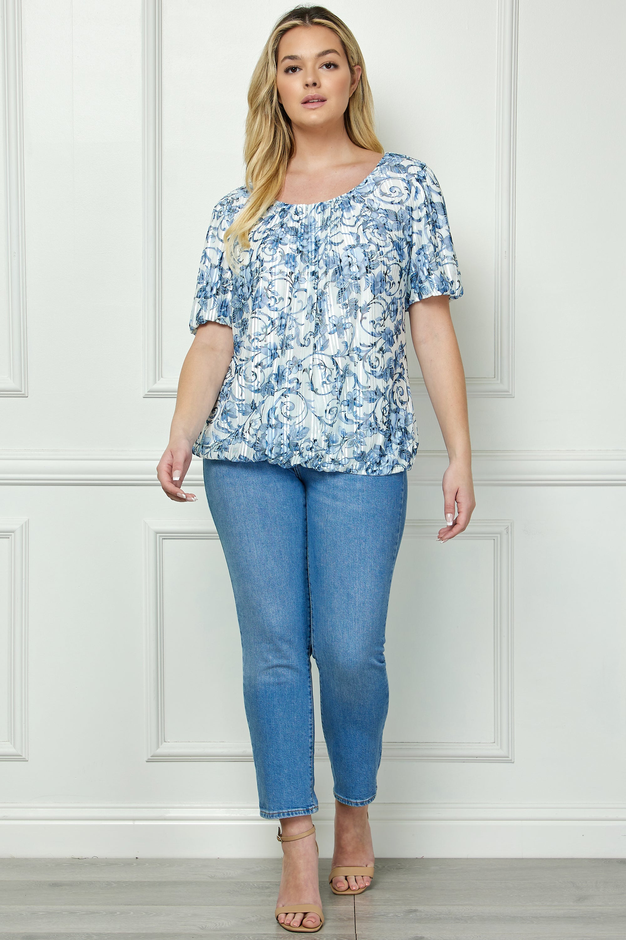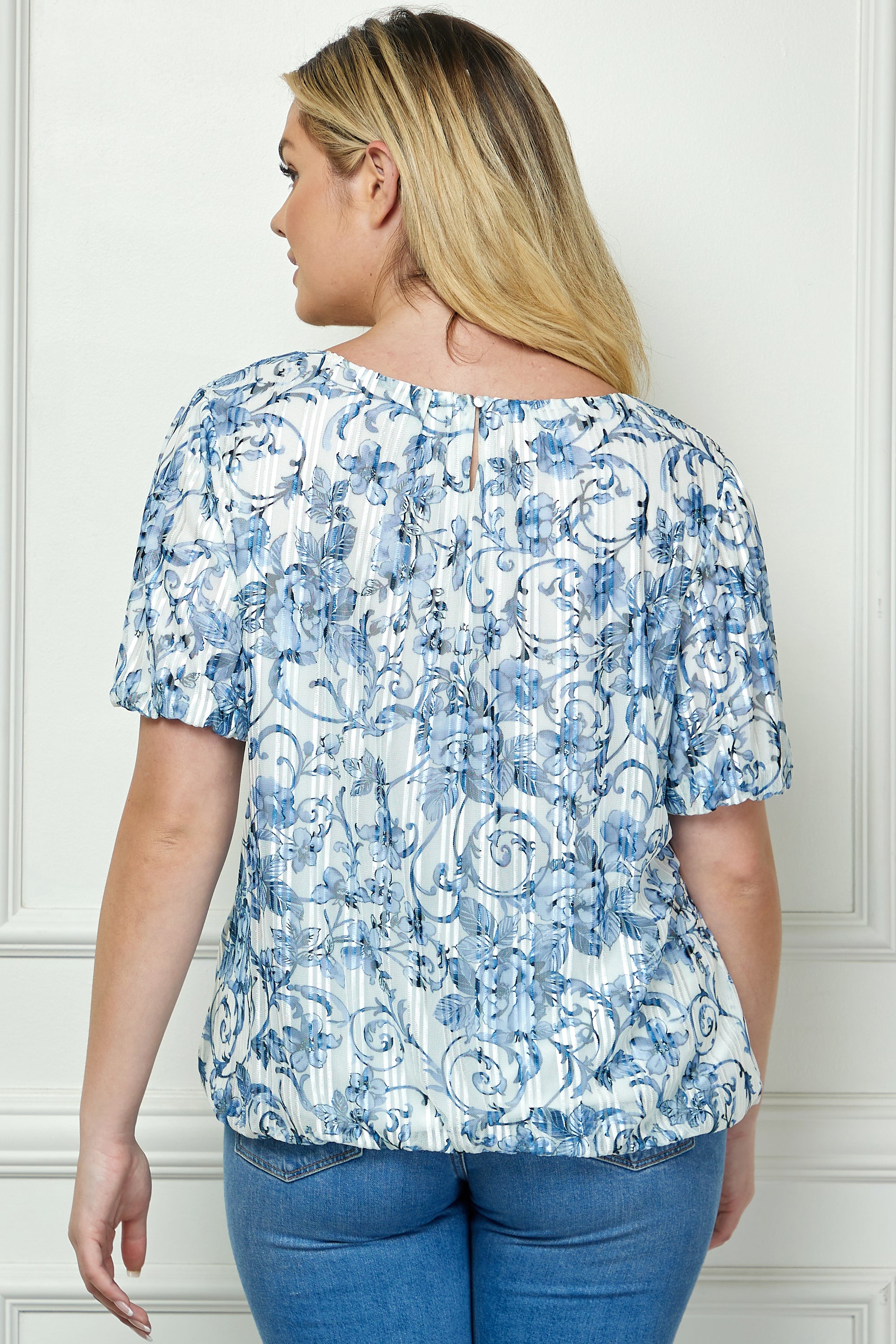 Short Puff Sleeve Pleat Scoop Neck Fully Lined Bubble Blouse in Print Poly/Spandex Cord Stripe Mesh with elegant Floral Print Design and Color, makes it a versatile blouse to wear for work and/or for a night out for dinner.