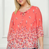 3/4 Button Cuff Sleeve Beaded Tie Front Neck Border Print Blouse - Plus