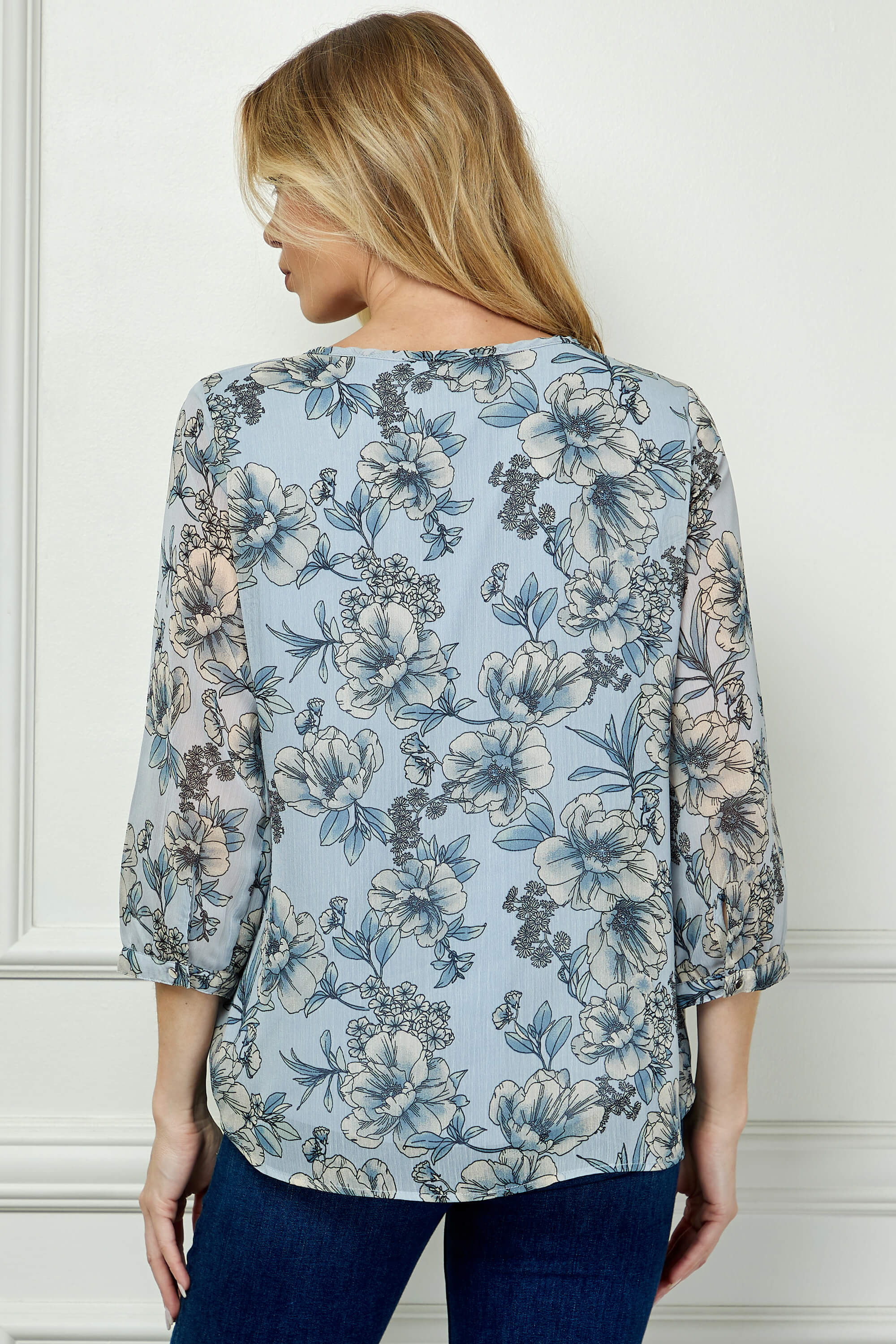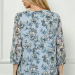 3/4 Button Cuff Sleeve Smock Shoulder Tie Neck Blouse in Blue - Floral