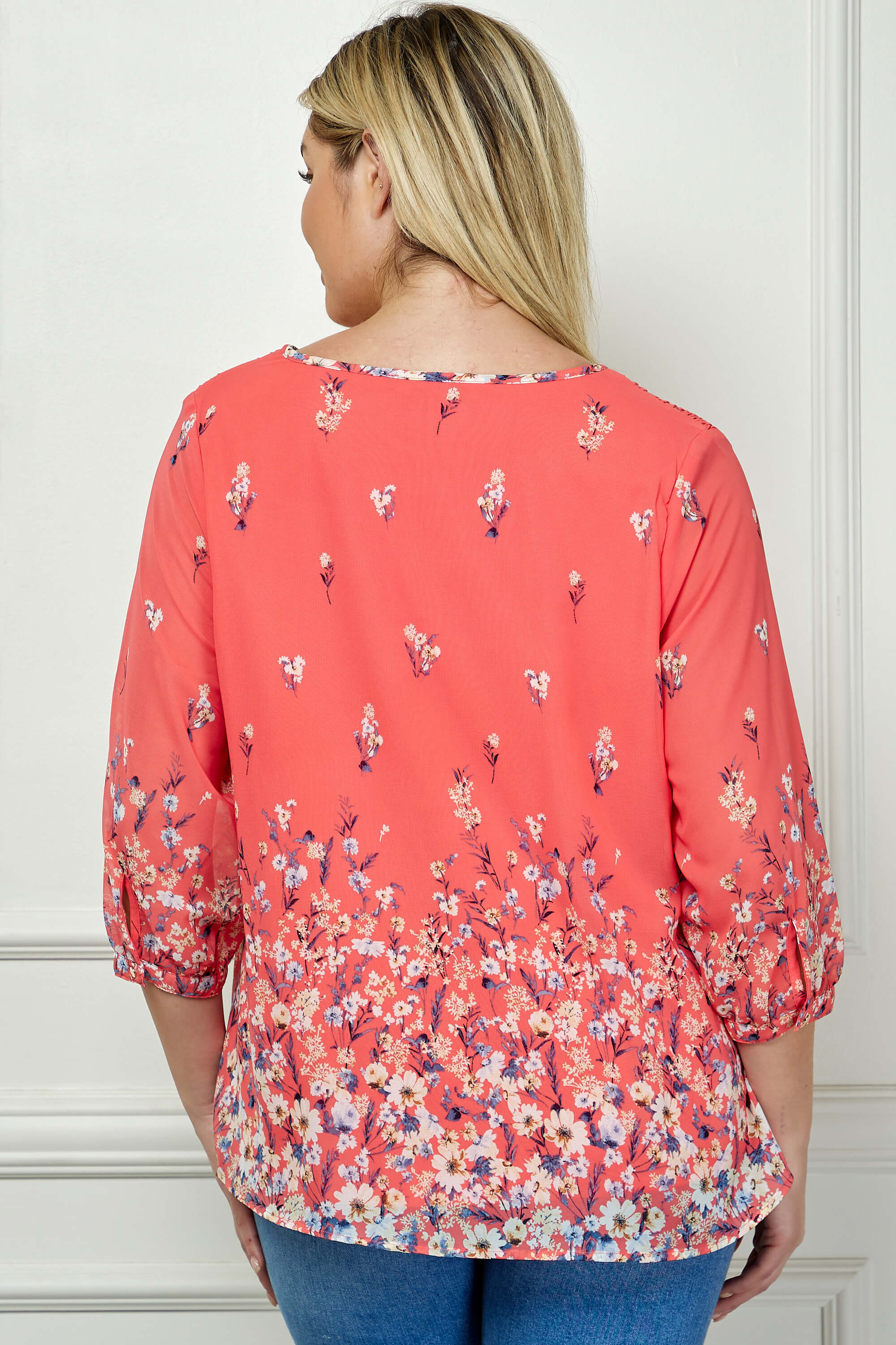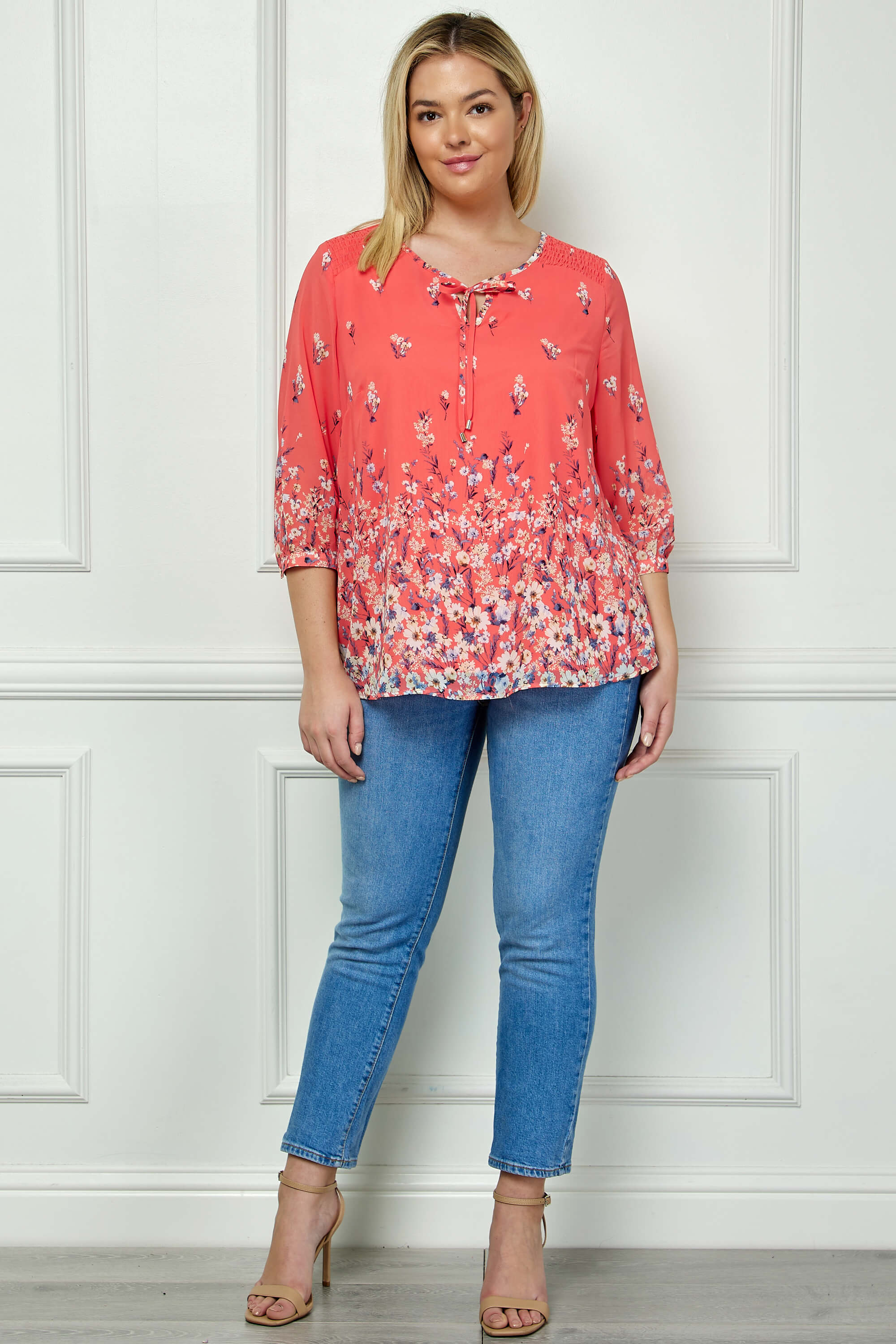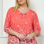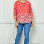3/4 Button Cuff Sleeve Tie Neck Border Print Blouse in Coral - Plus