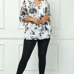 3/4 Button Tab Sleeve Mandarin Collar Blouse in Ivory/Gray - Plus