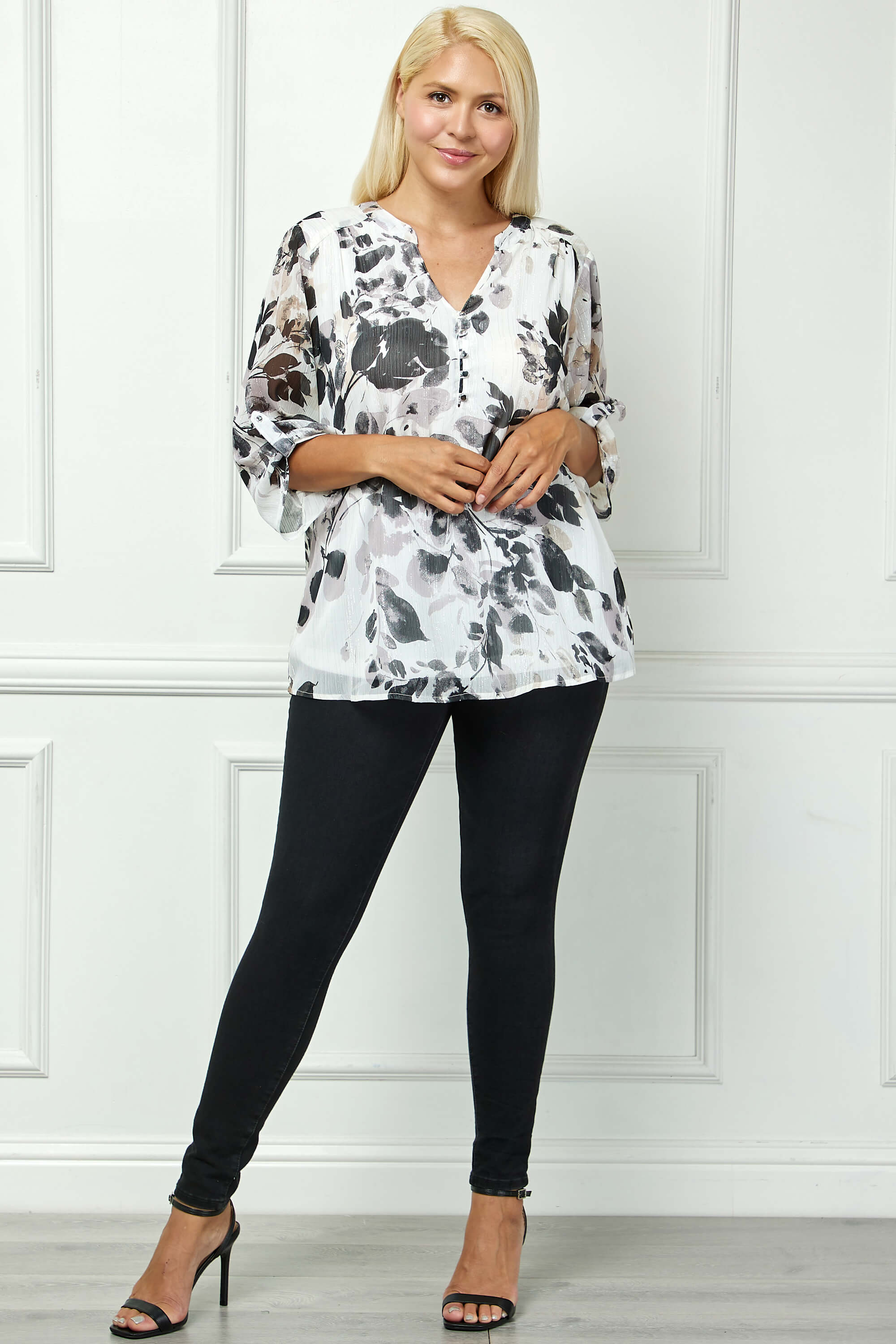 Designed with 3/4 sleeves featuring button tabs, it offers flexible styling—wear them rolled for a casual feel or down for a more polished finish. Fully lined for a smooth drape and confident coverage, this piece pairs easily with trousers, skirts, or denim for seamless day-to-night wear.