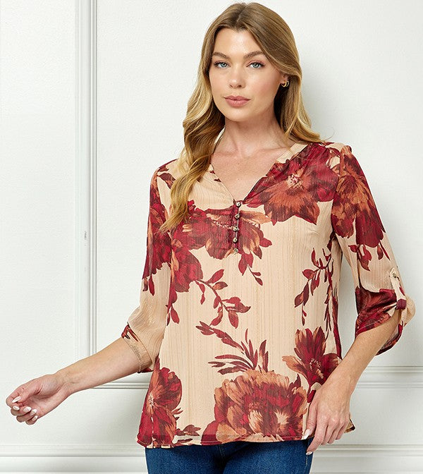 The 3/4 sleeves with button tabs allow for easy styling—wear them rolled up for a relaxed feel or down for a more polished finish. Designed with a flattering popover silhouette and full lining for a smooth drape, it pairs beautifully with trousers, skirts, or jeans for any occasion.