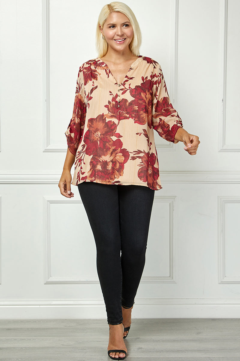 The 3/4 sleeves with button tabs allow for easy styling—wear them rolled up for a relaxed feel or down for a more polished finish. Designed with a flattering popover silhouette and full lining for a smooth drape, it pairs beautifully with trousers, skirts, or jeans for any occasion.
