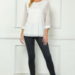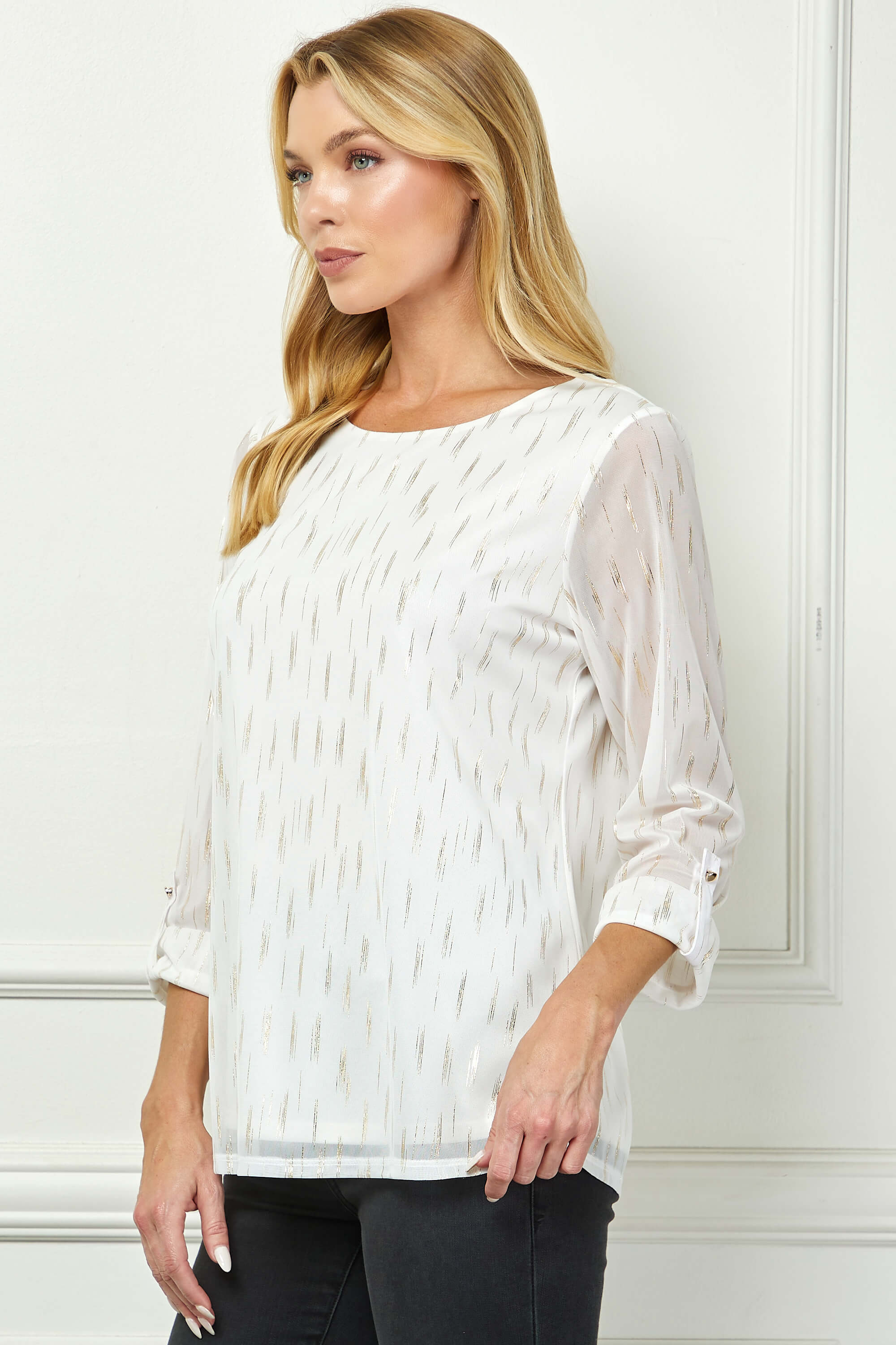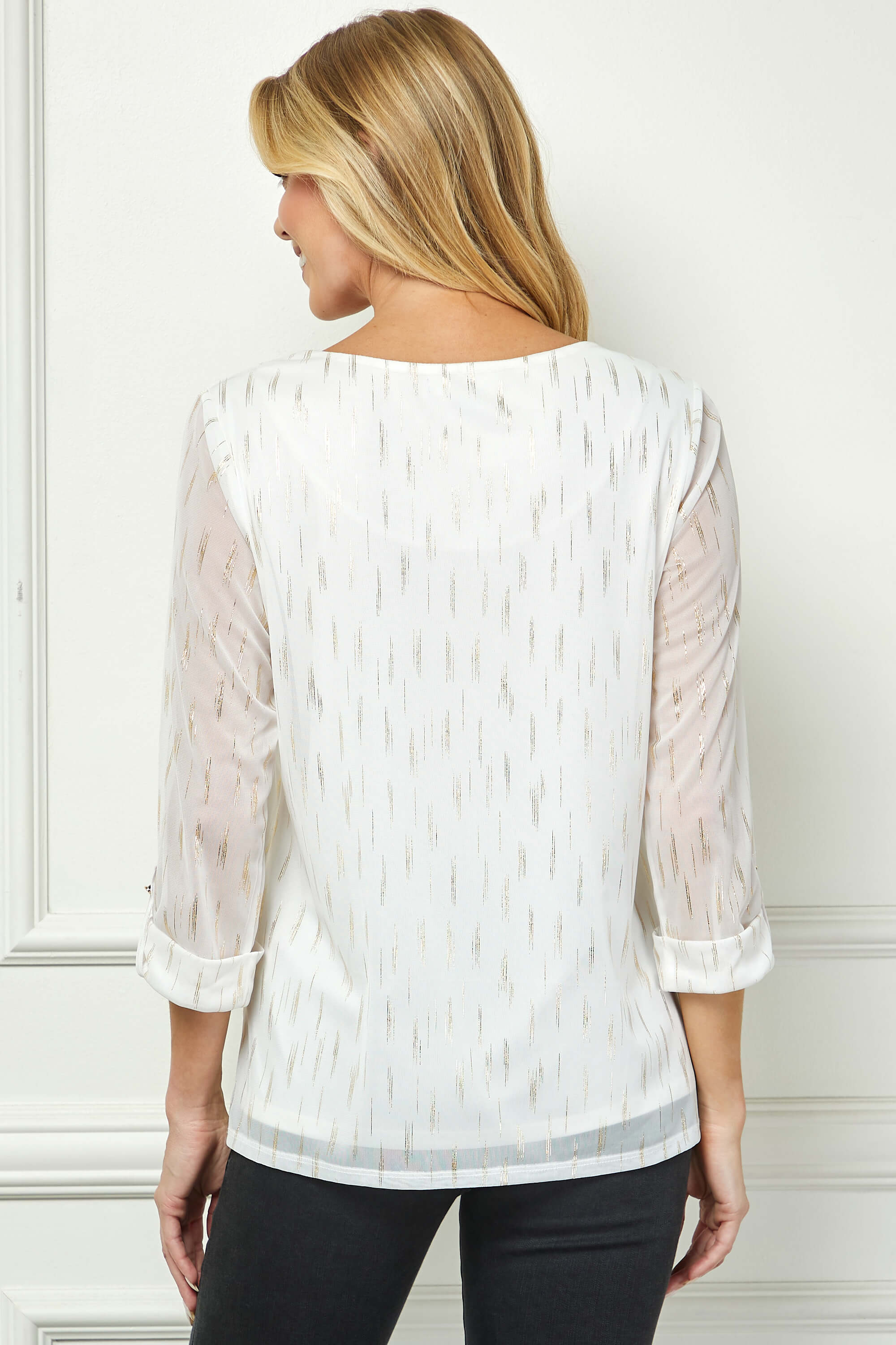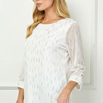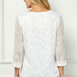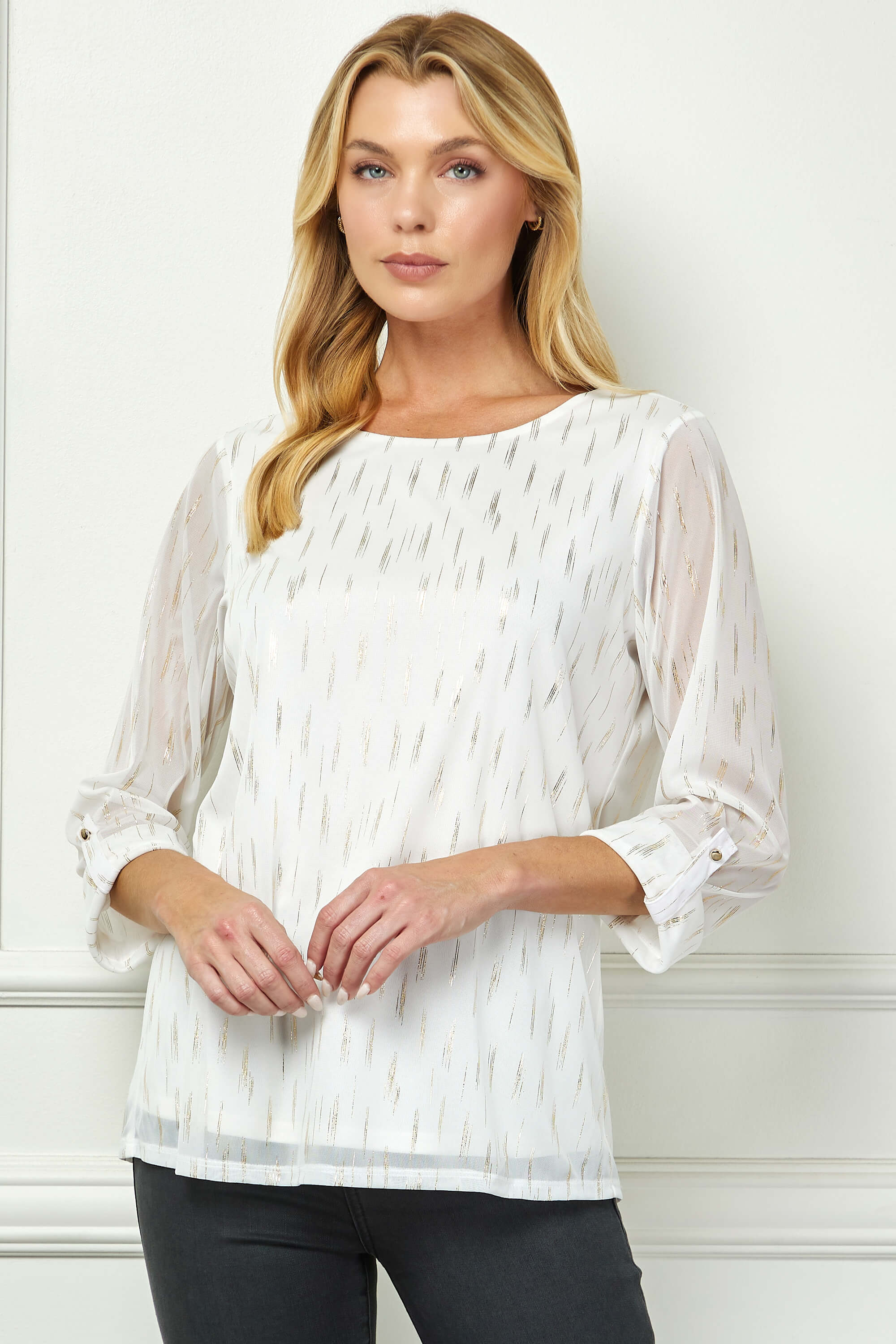 3/4 Button Tab Sleeve Scoop Neck Foil Blouse in Ivory