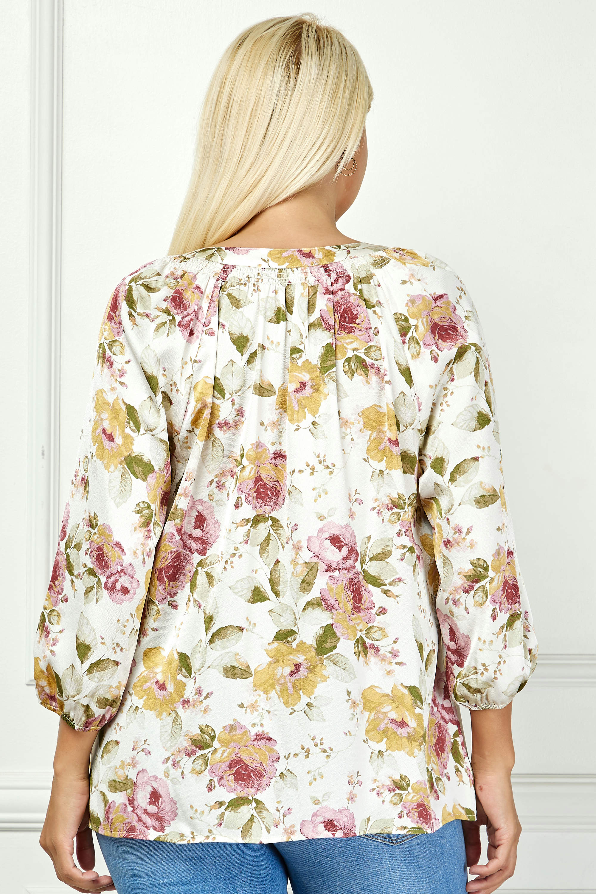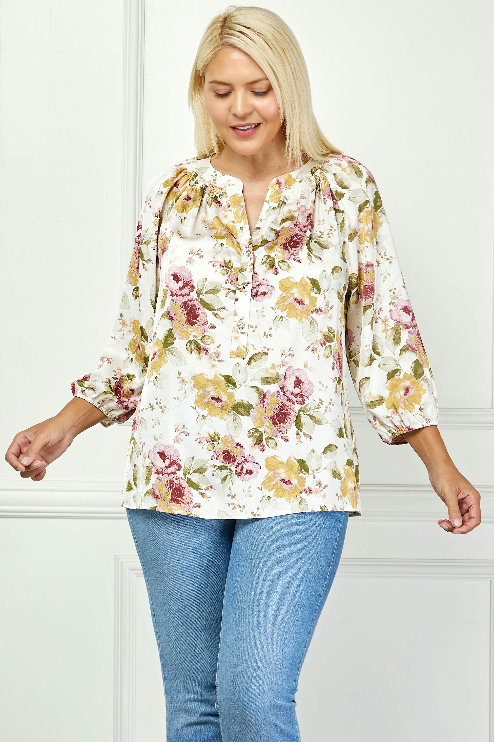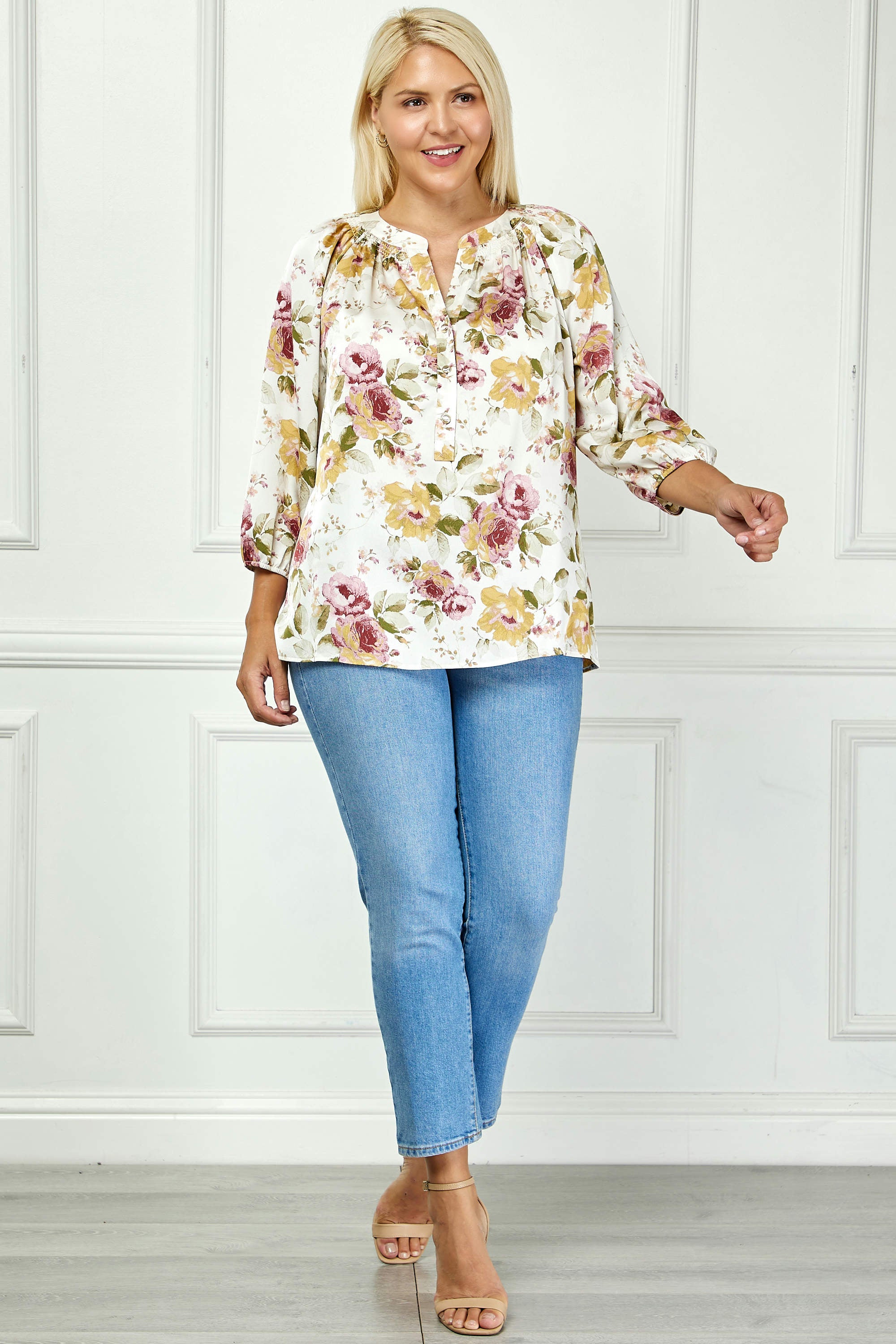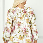 3/4 Elastic Cuff Sleeve Mandarin Collar Popover Blouse in Cream - Plus