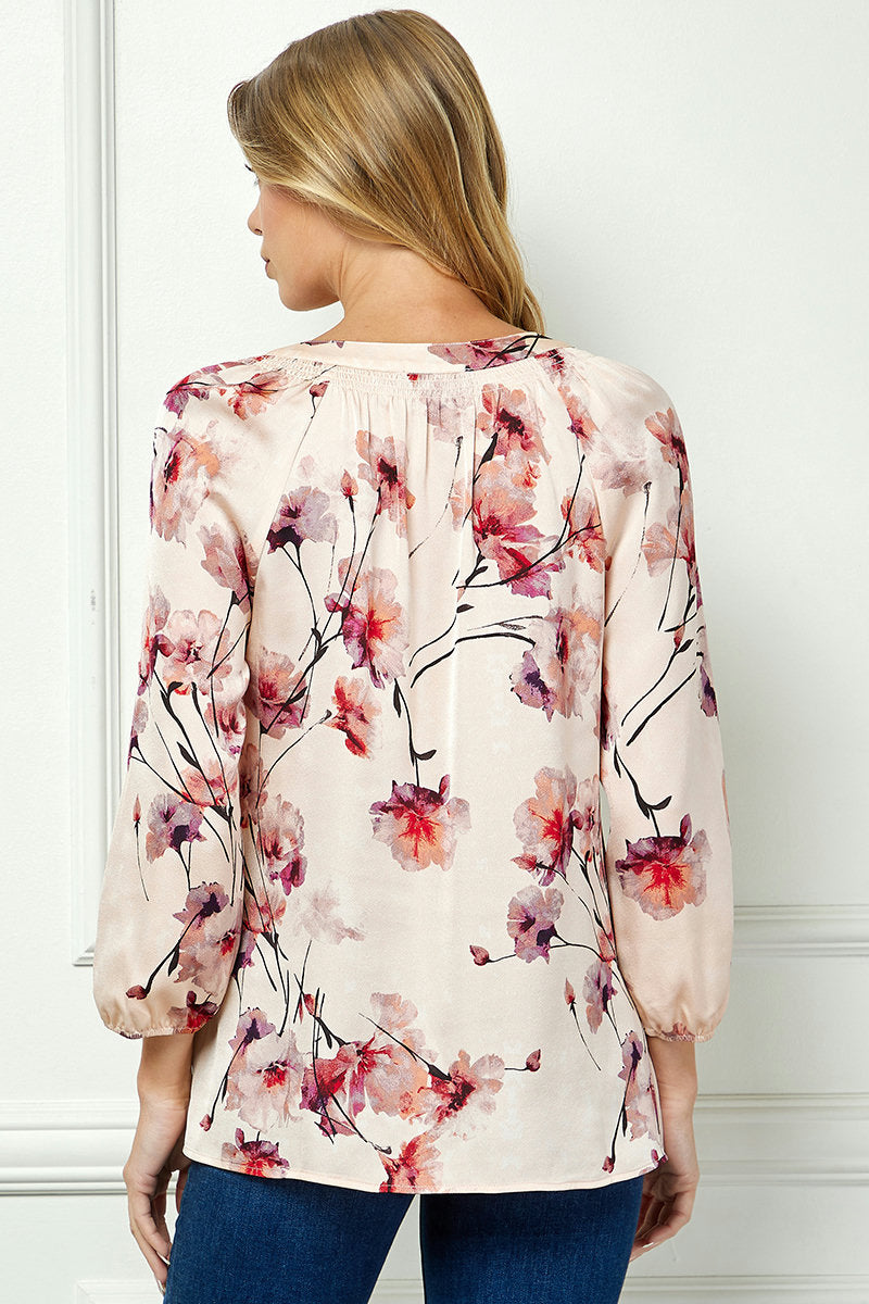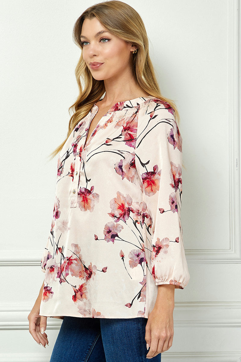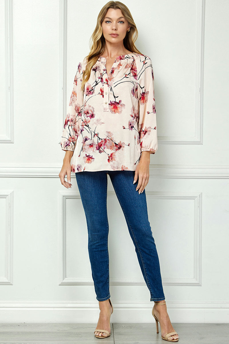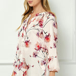 3/4 Elastic Cuff Sleeve Mandarin Collar Popover Blouse in Pink