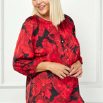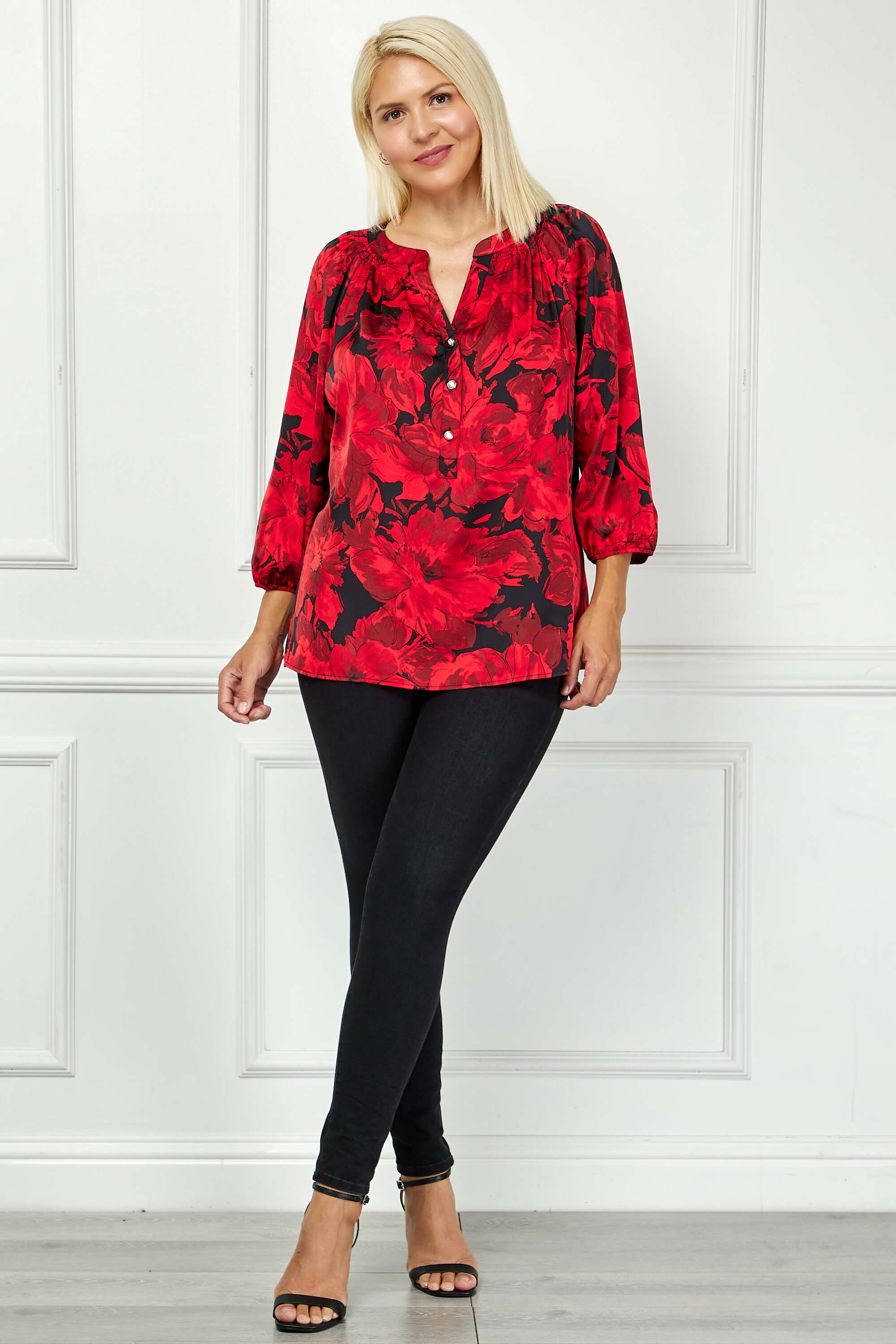 3/4 Elastic Cuff Sleeve Mandarin Collar Popover Blouse in Red -Plus