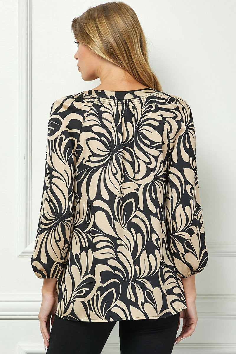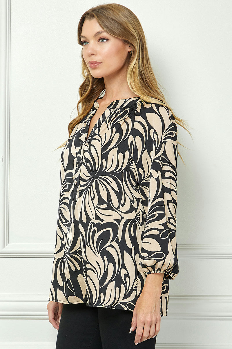 3/4 Elastic Cuff Sleeve Mandarin Collar Popover Blouse in Tan