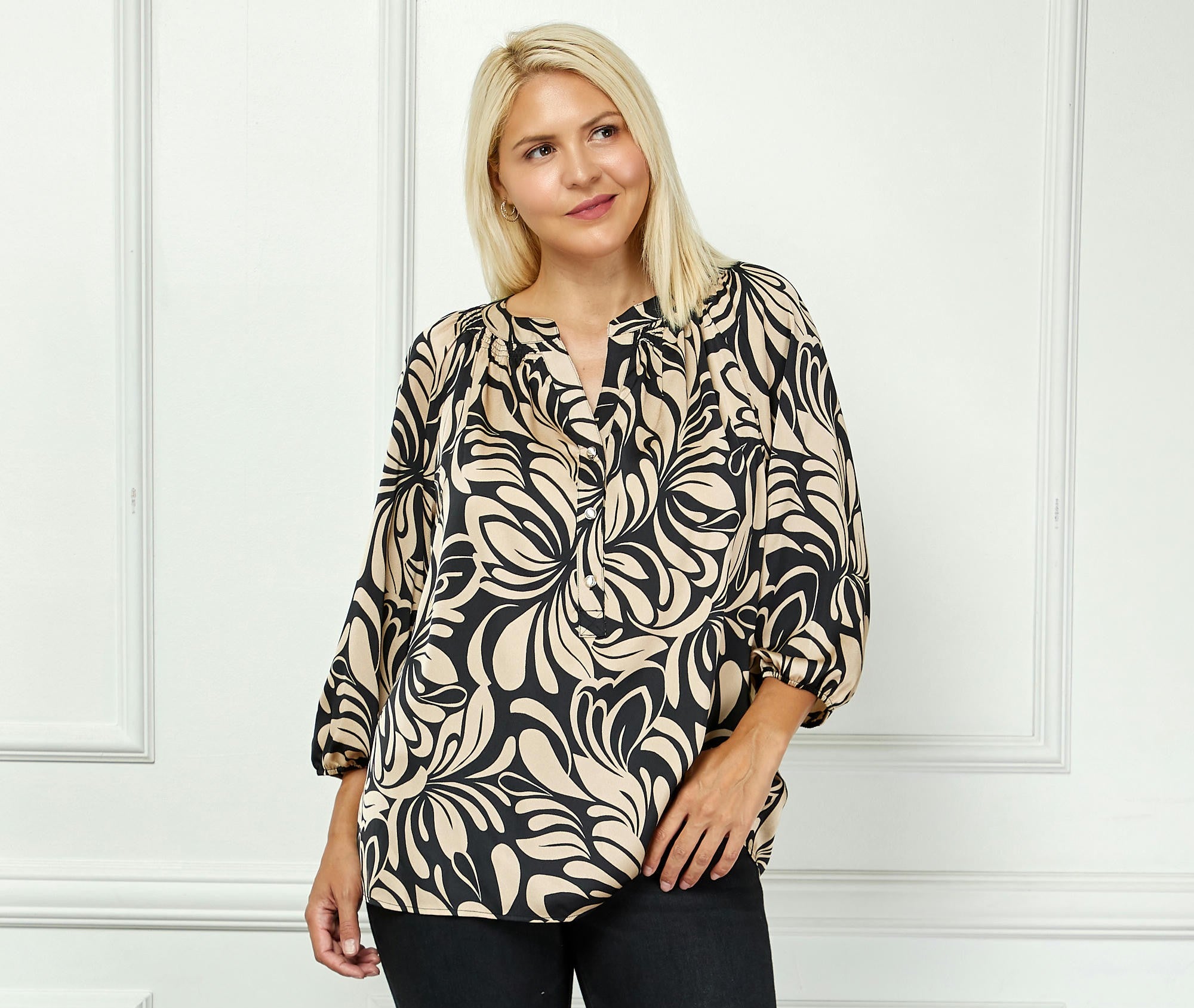 Effortlessly polished and easy to wear, this blouse blends refined design with everyday comfort. The relaxed popover silhouette offers a flattering fit, while the mandarin collar adds a modern, structured touch that elevates any outfit.