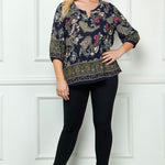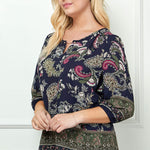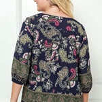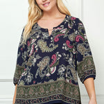 3/4 Elastic Sleeve Cutout Trim Front Neck Border Print Blouse in Navy - Plus