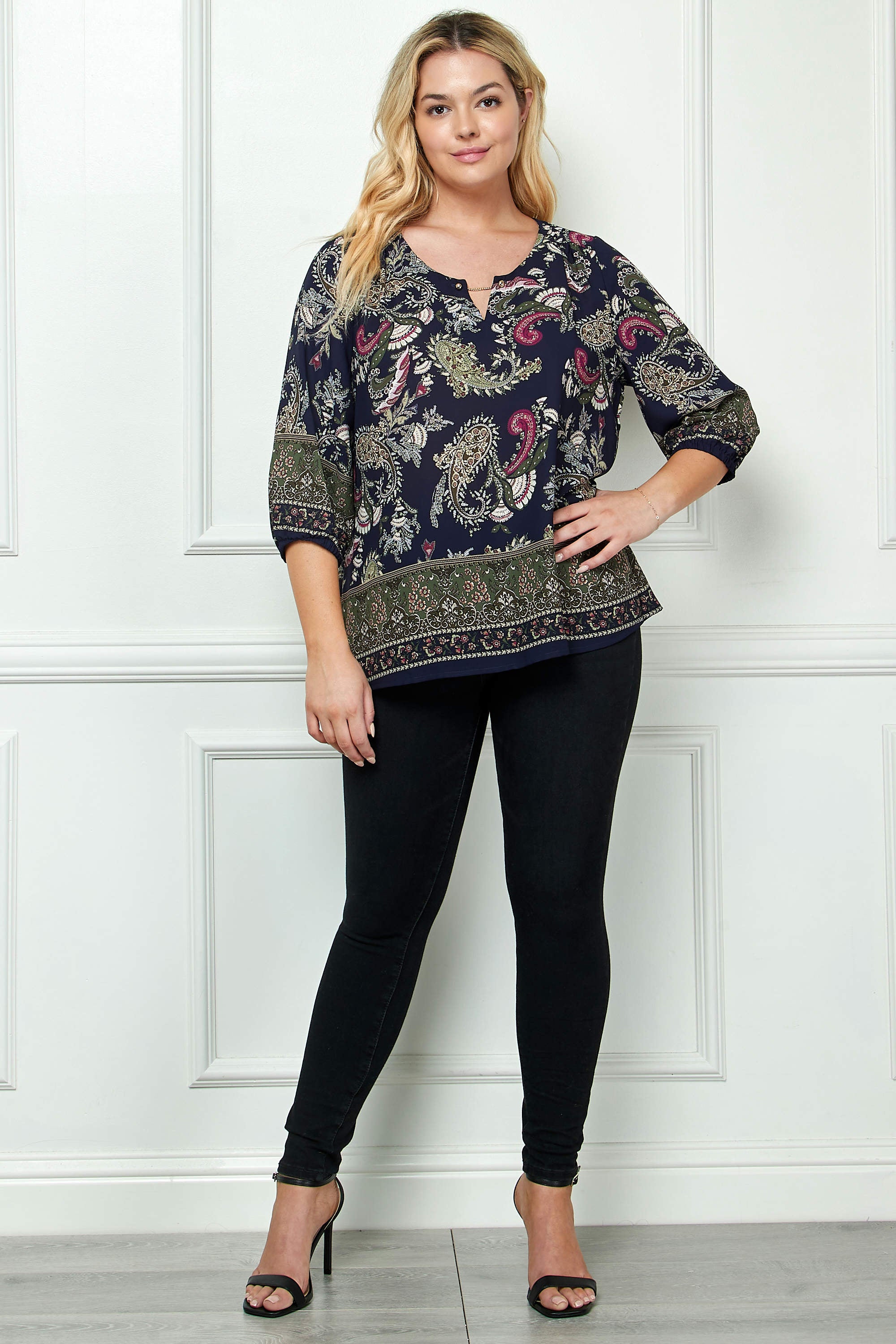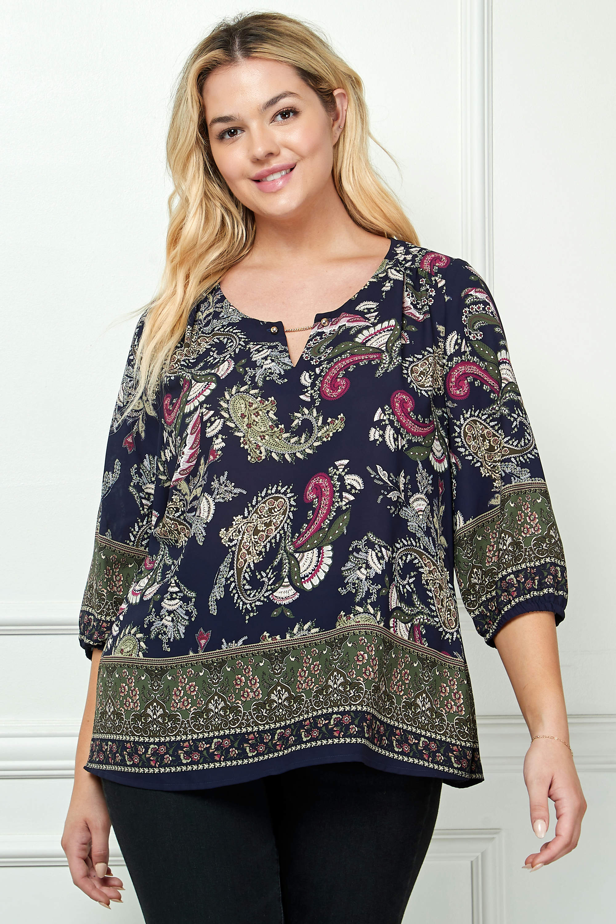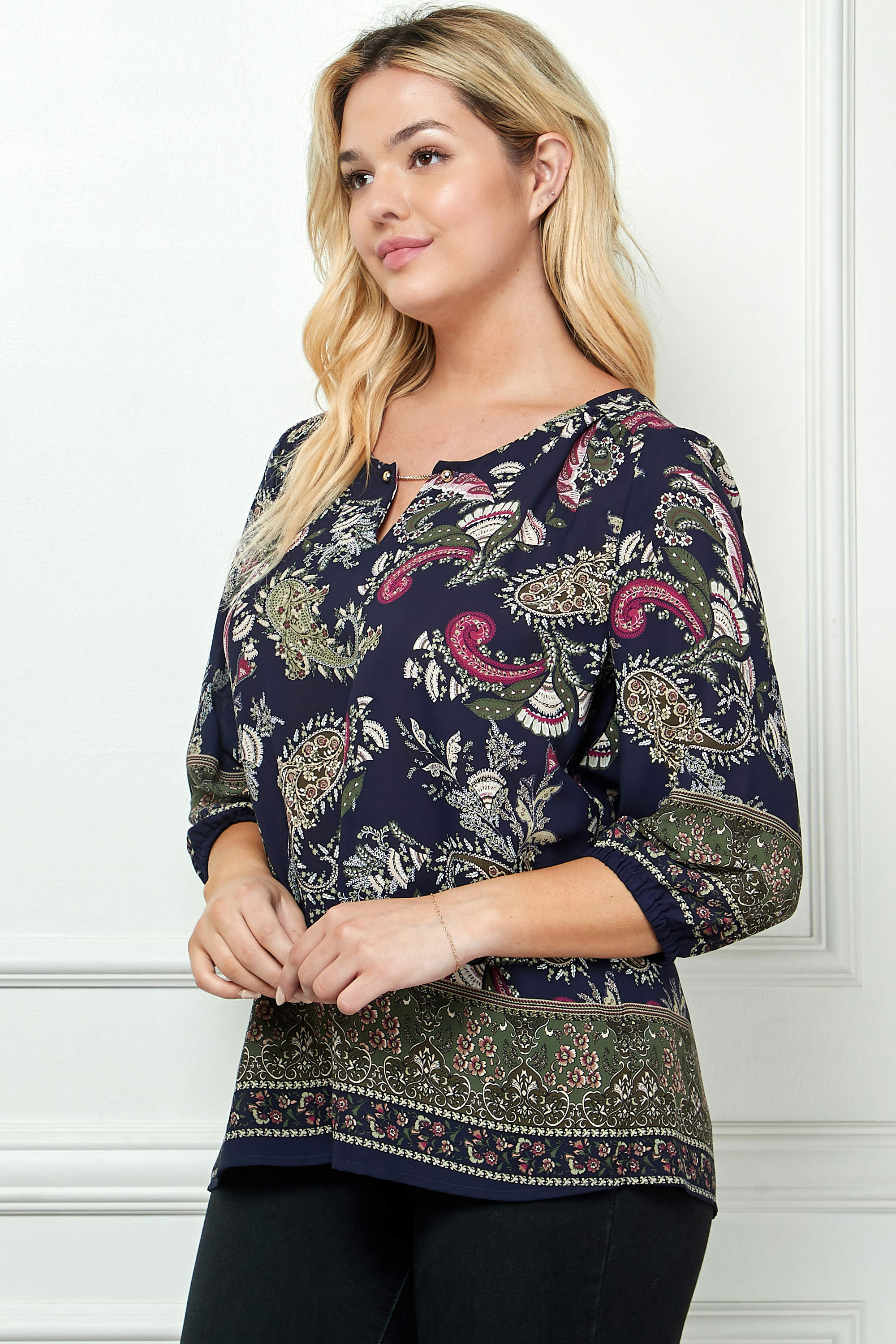 The cutout trim neckline adds a touch of modern flair, while the 3/4 elastic sleeves ensure a comfortable, easy fit with subtle shaping. Finished with a bold border print design, this blouse transitions seamlessly from office days to evening outings.