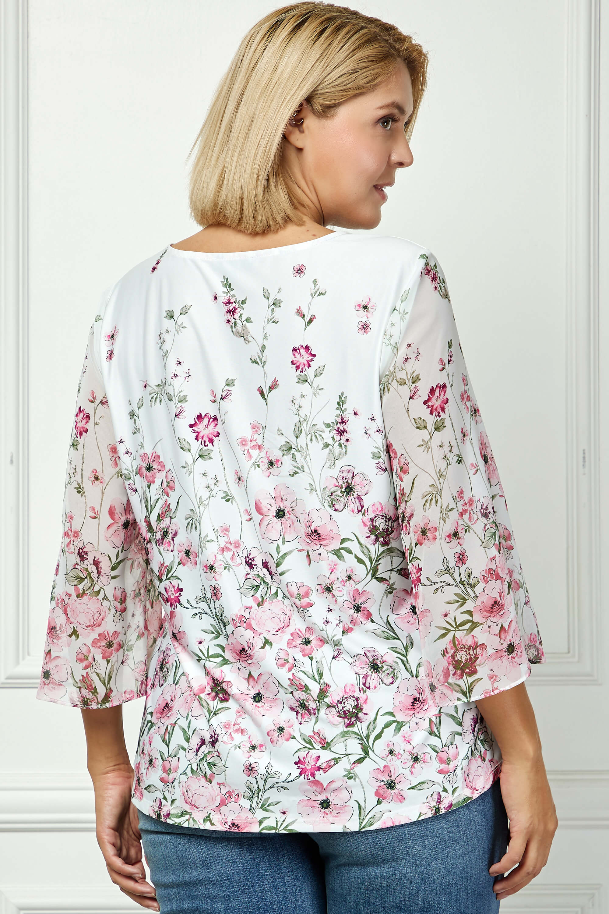 Designed with 3/4 flare sleeves, it offers soft movement and feminine flow that elevate everyday styling. The mix-media construction provides comfort and texture, making this piece perfect for both polished workwear and elevated casual looks. Pair it effortlessly with trousers, skirts, or denim for versatile wear.
