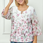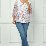 3/4 Flare Sleeve Cutout Neck Border Print Blouse - Ivory - Plus