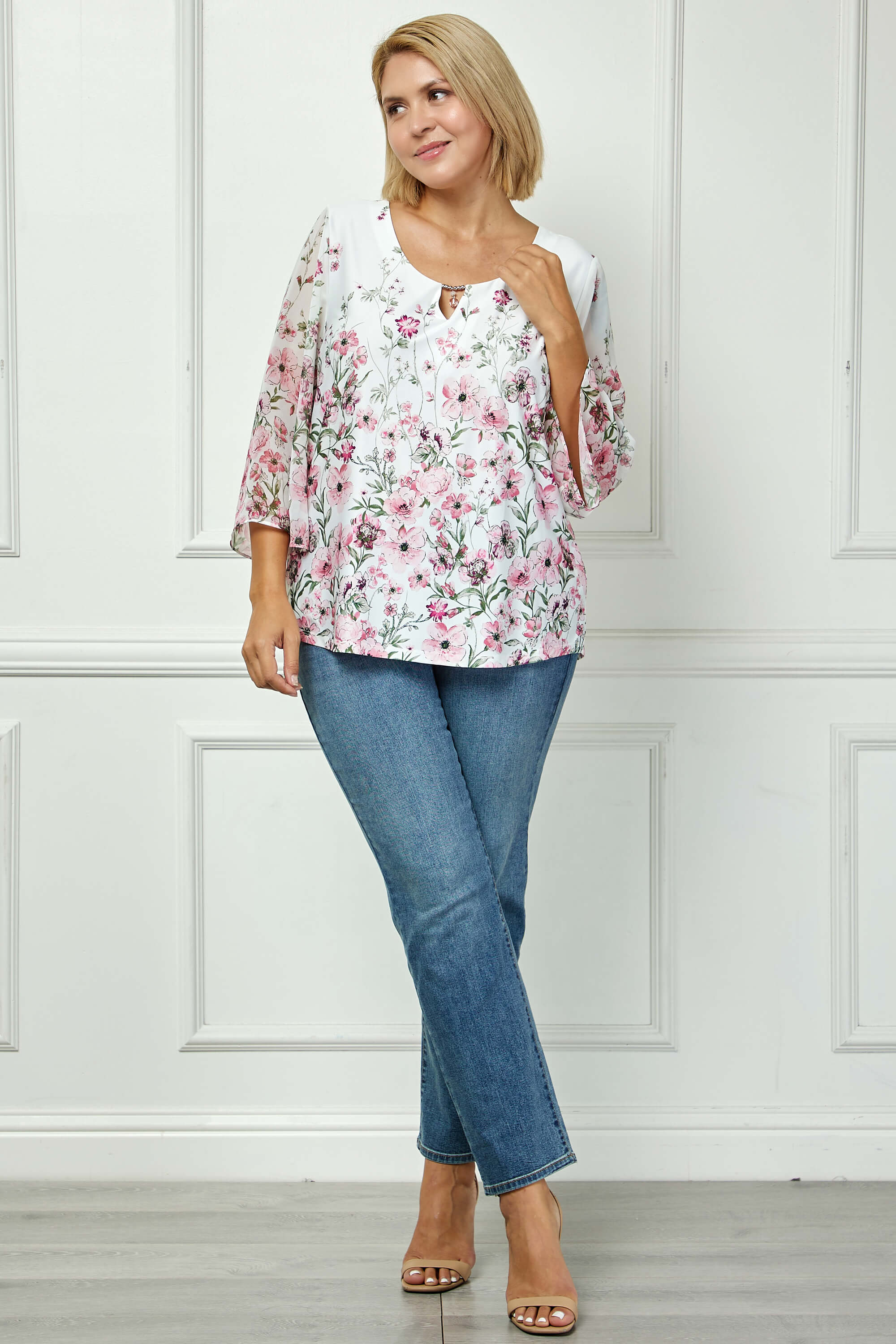 Graceful and eye-catching, this blouse blends elegant detailing with an easy, flattering silhouette. The cutout neckline adds a modern touch, while the border print design brings visual interest and a refined finish.