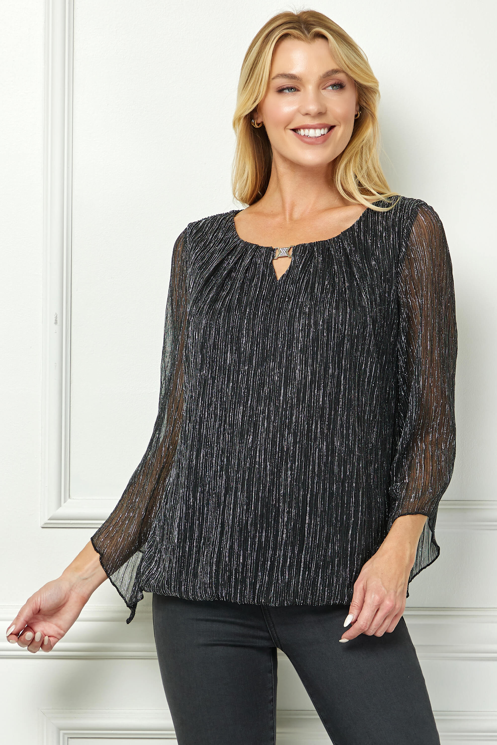 Elegant and effortlessly chic, this blouse combines soft movement with refined detailing. The 3/4 flare sleeves create a graceful silhouette, while the cutout neckline adds a modern touch of sophistication.
