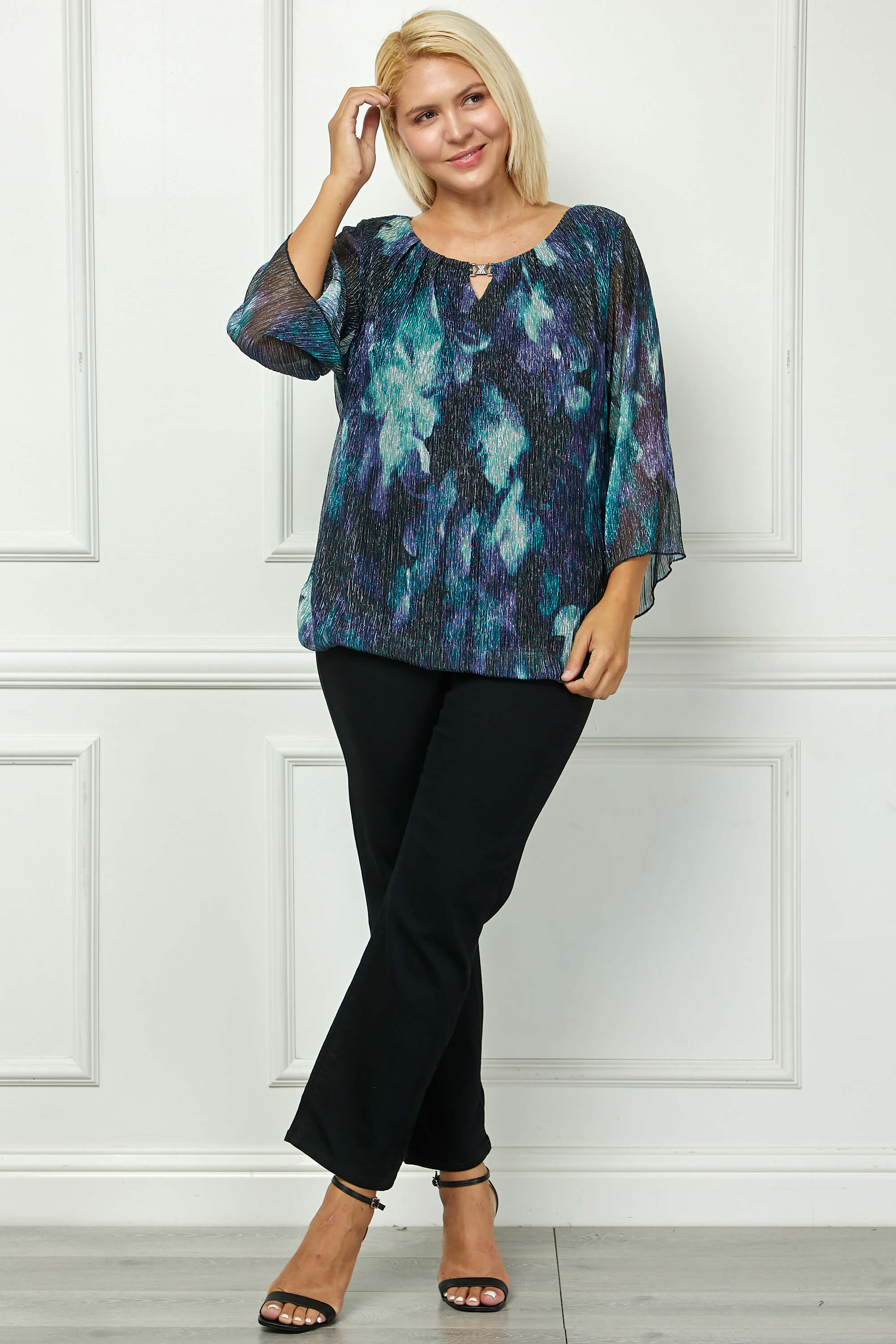Elegant and effortlessly chic, this blouse combines soft movement with refined detailing. The 3/4 flare sleeves create a graceful silhouette, while the cutout neckline adds a modern touch of sophistication.