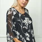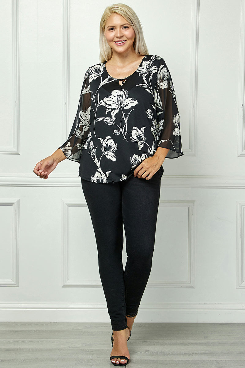 3/4 Flare Sleeve Cutout Trim Front Neck Swing Blouse in Black - Plus