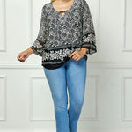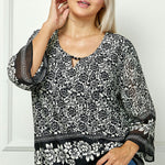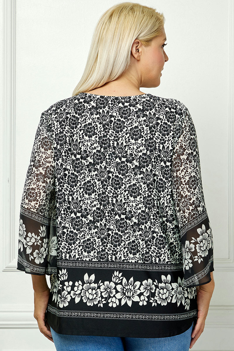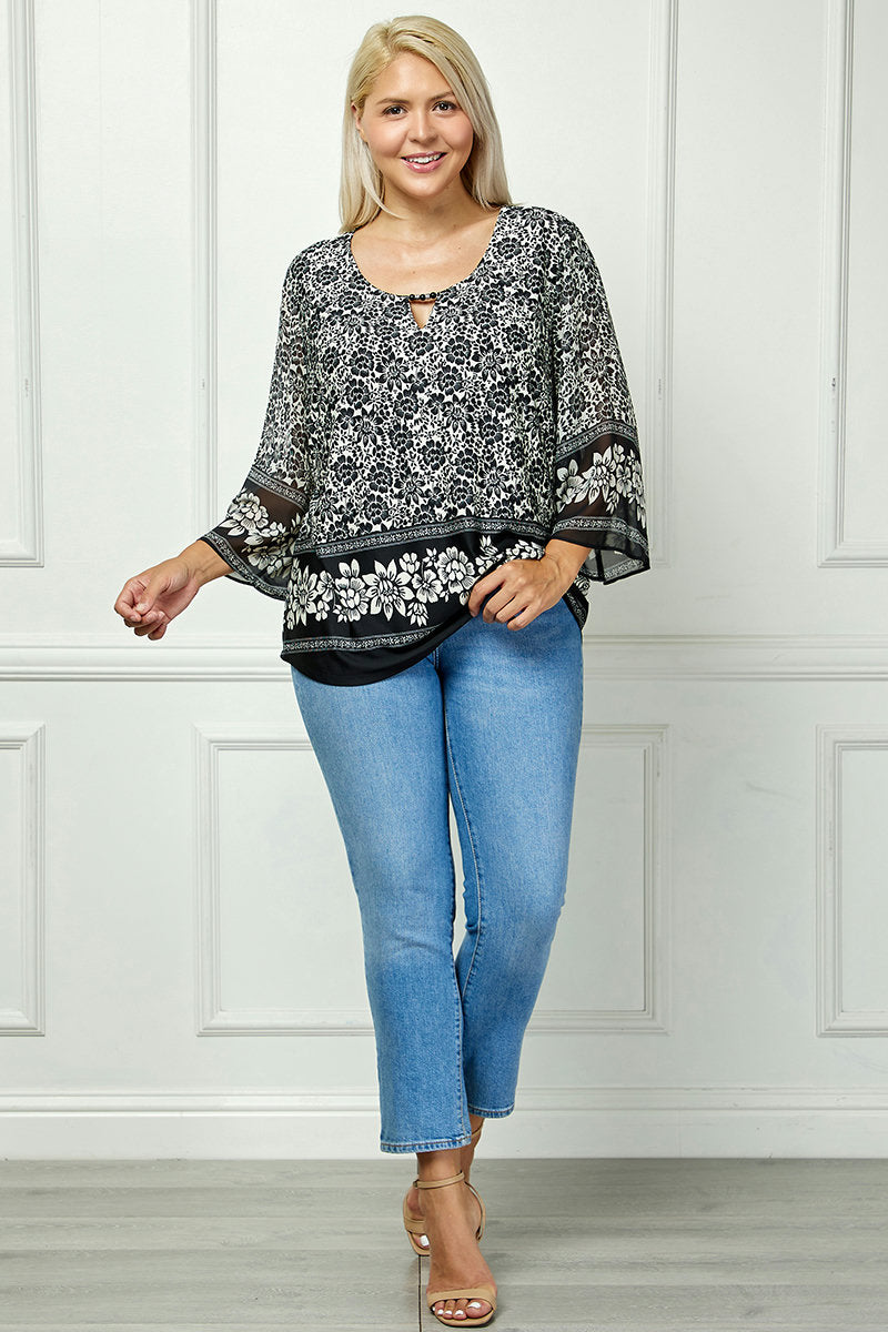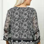 3/4 Flare Sleeve Cutout Trim Mix Media Blouse in Black - Plus