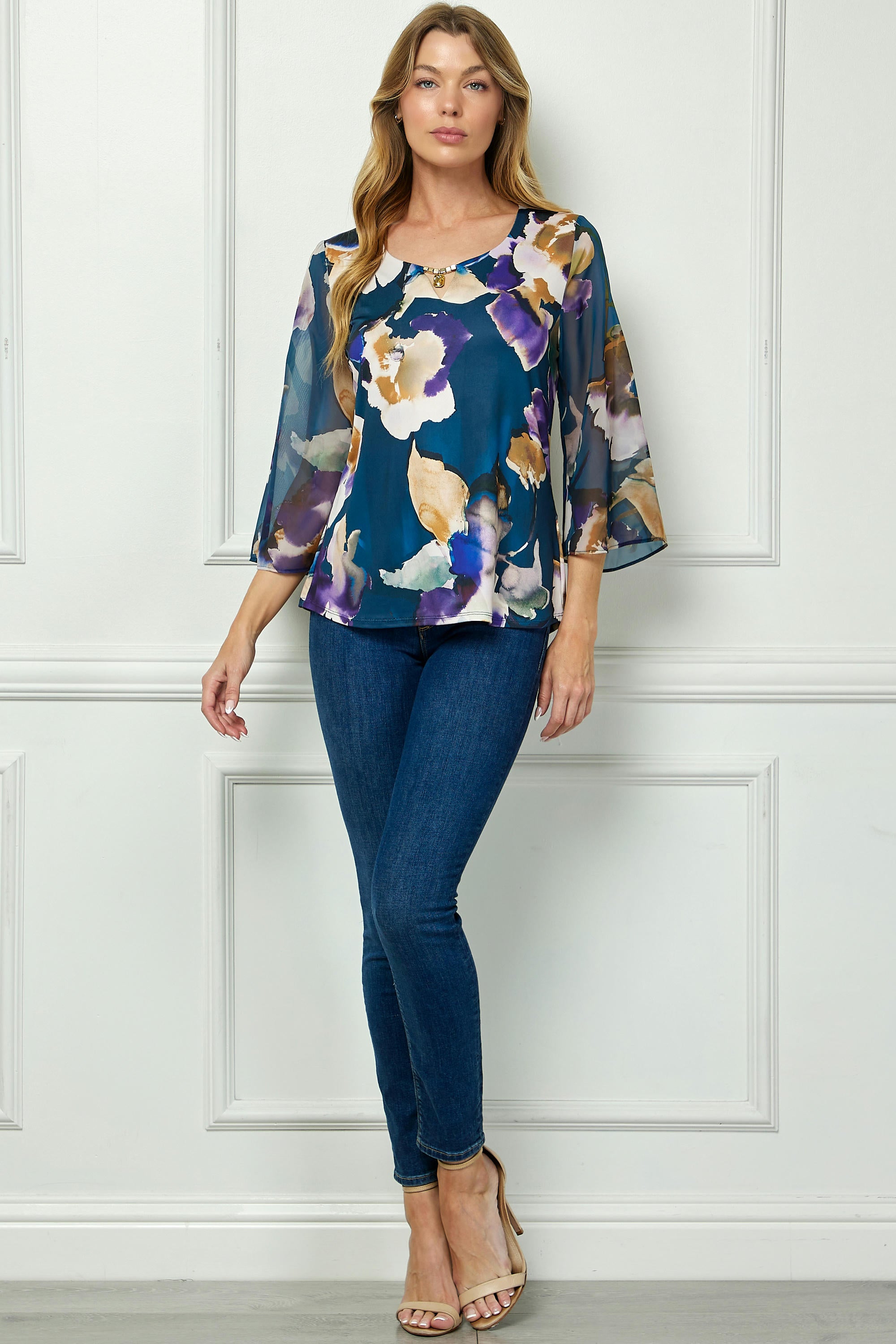 The 3/4 flare sleeves create a soft, flowing shape that moves effortlessly, offering both comfort and style. Crafted in a mix-media fabric for a lightweight yet polished feel, this piece transitions seamlessly from office hours to evening outings.