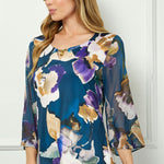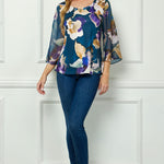 3/4 Flare Sleeve Cutout Trim Mix Media Blouse in Navy