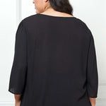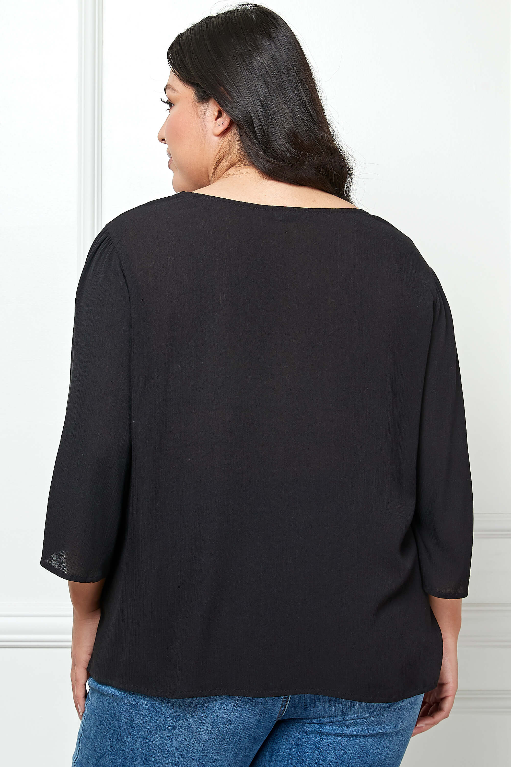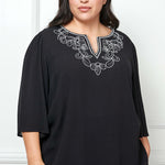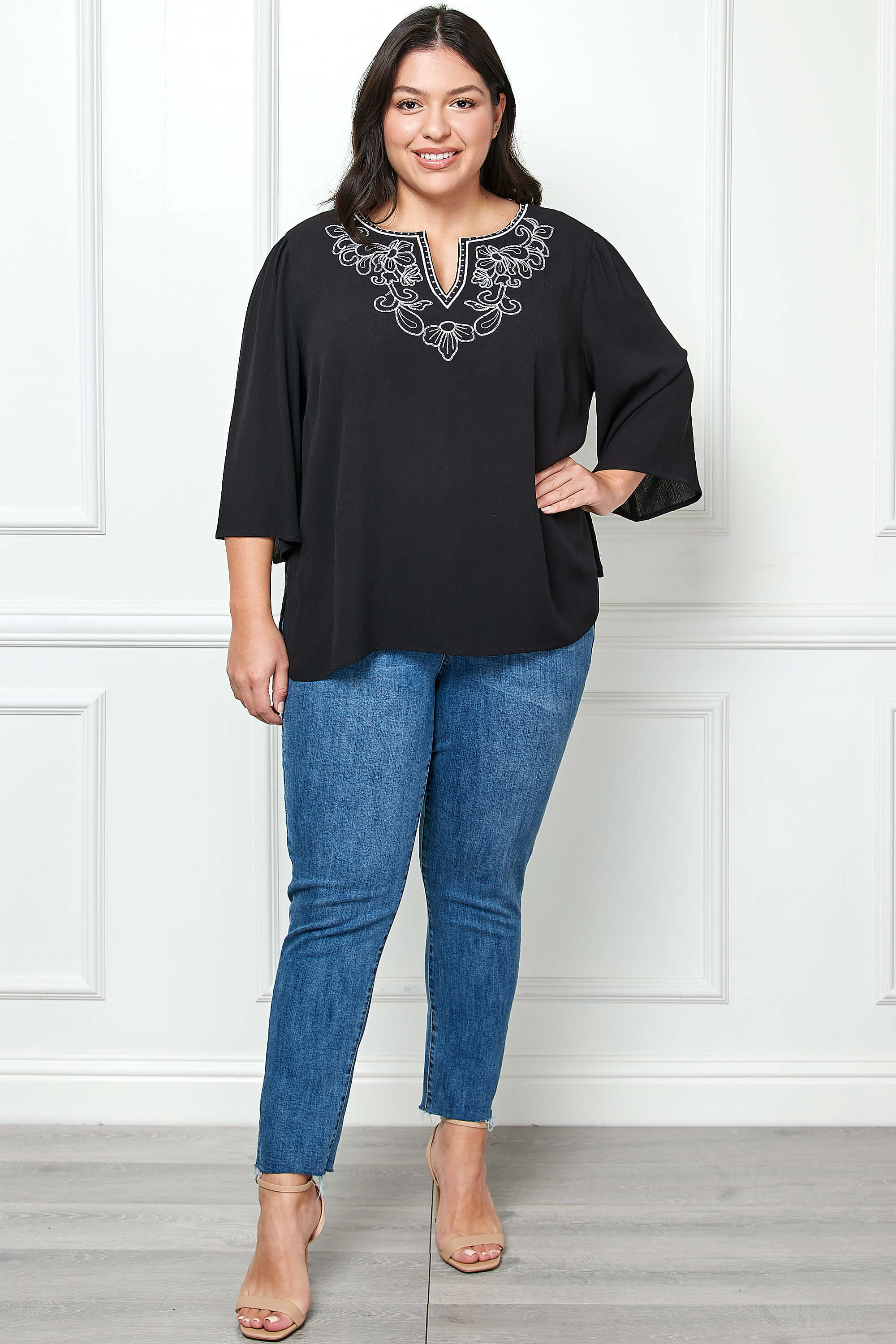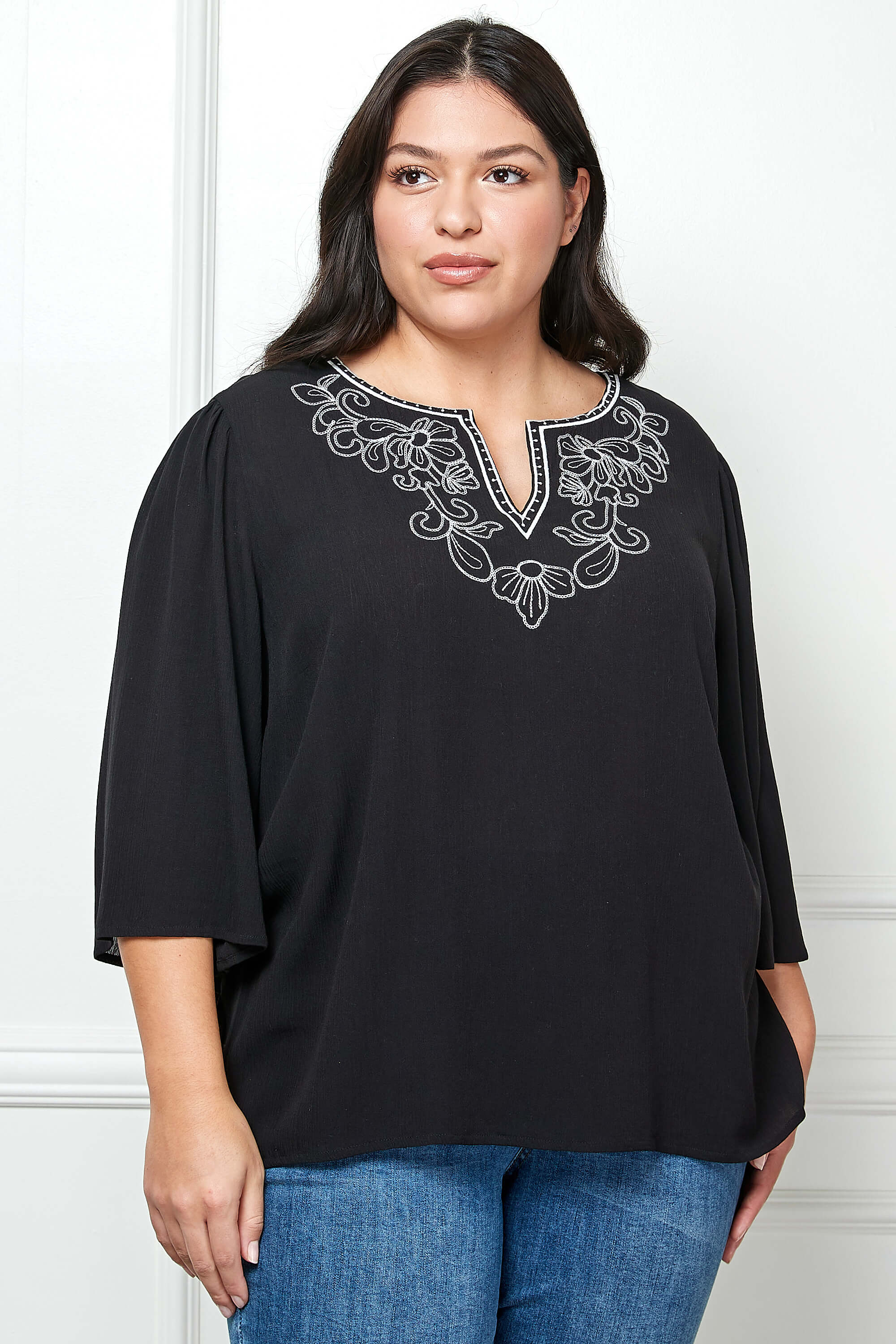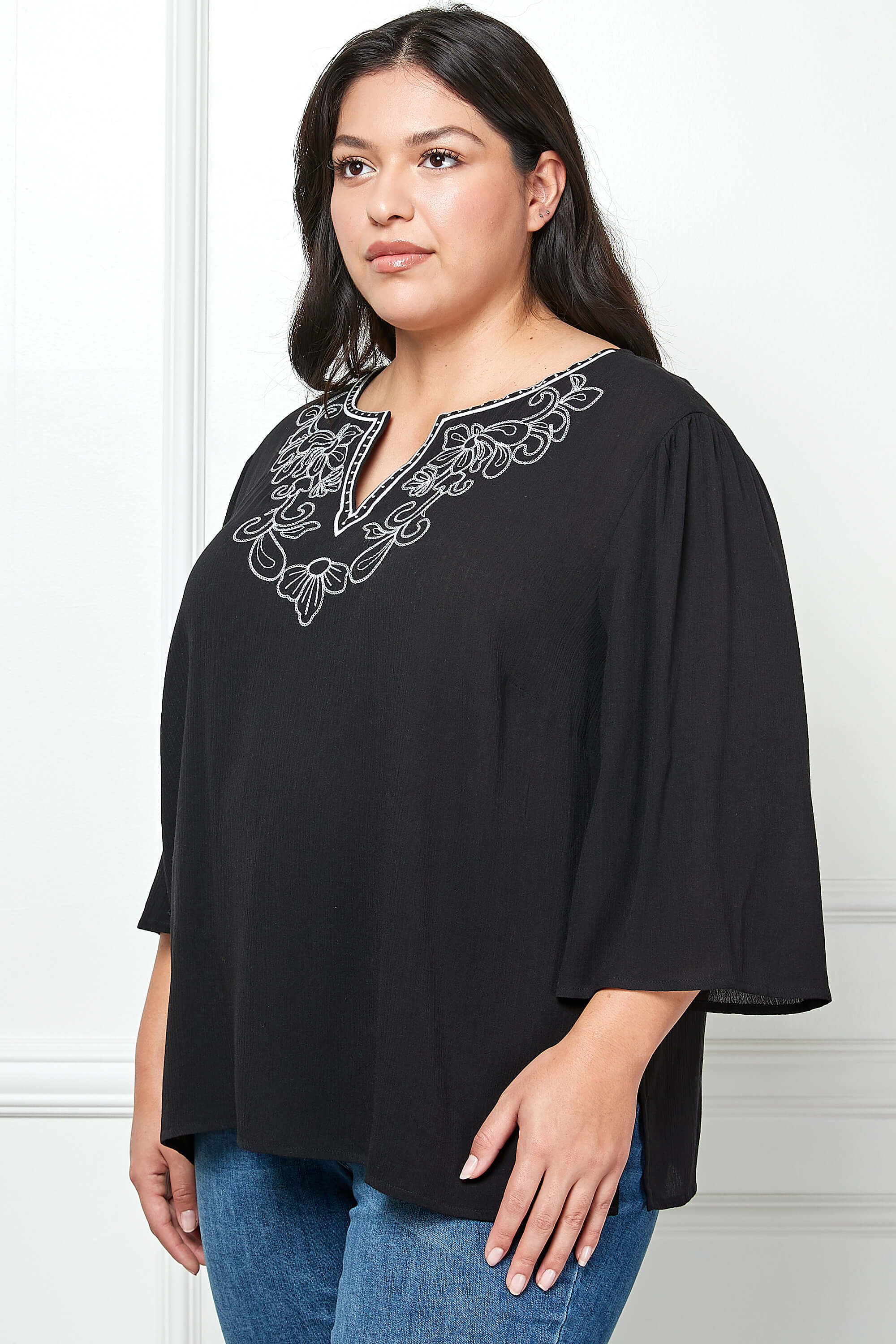 Roz and Ali 3/4 Flare Sleeve Embroidered Yoke Tunic in Black - Plus