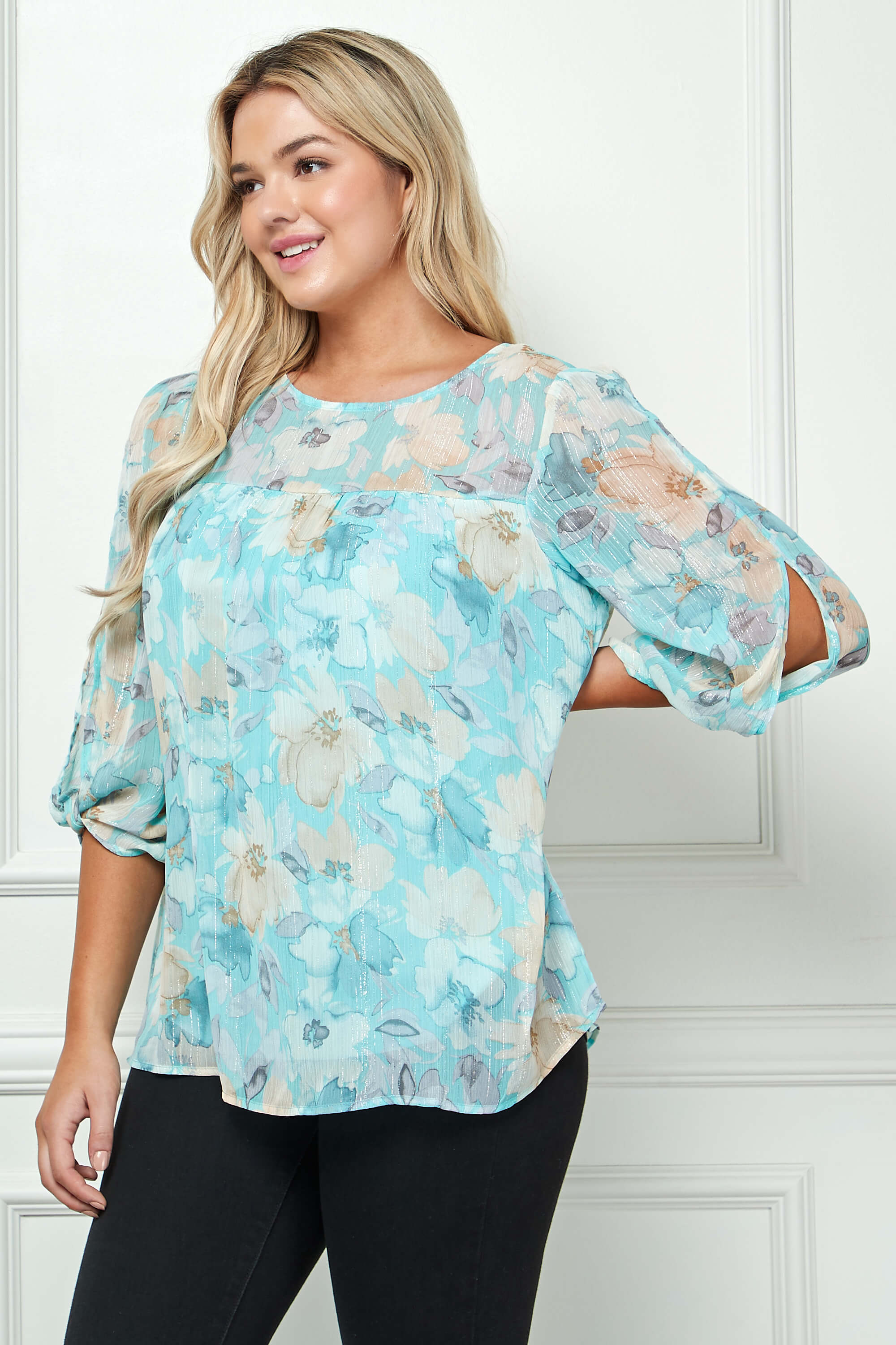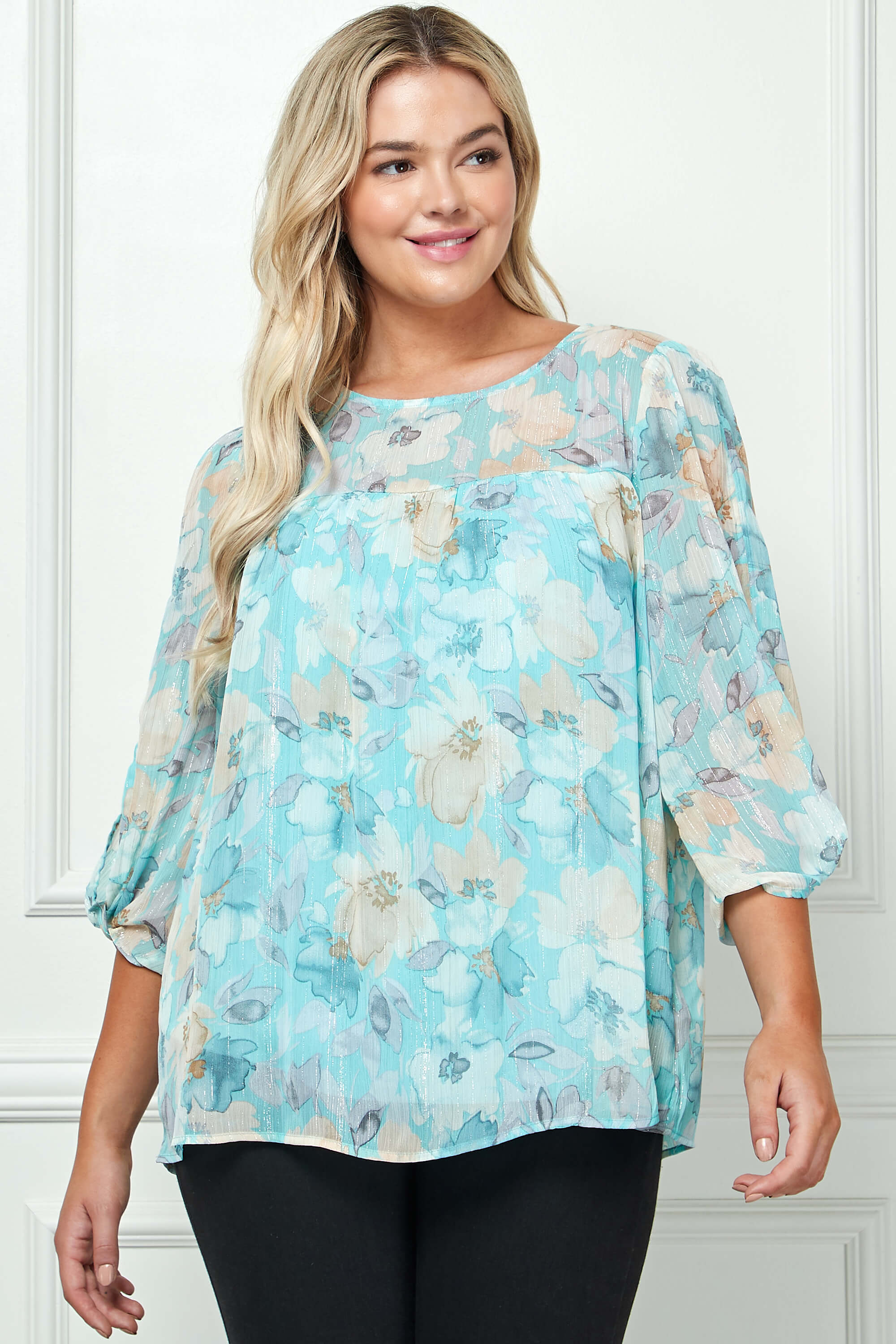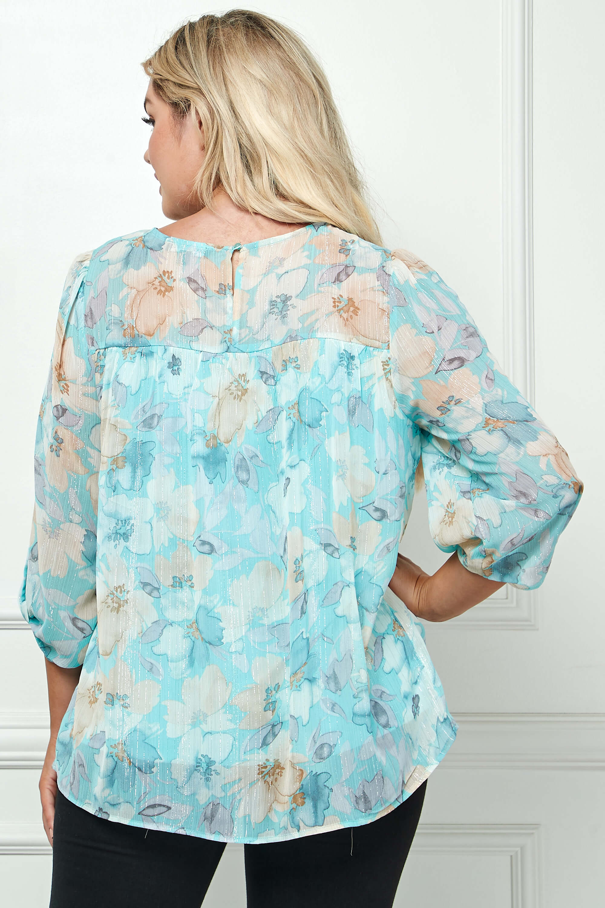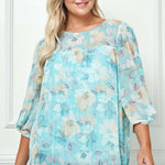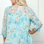 3/4 Knot Sleeve Scoop Neck Yoke Blouse in Aqua Flower - Plus