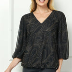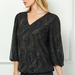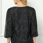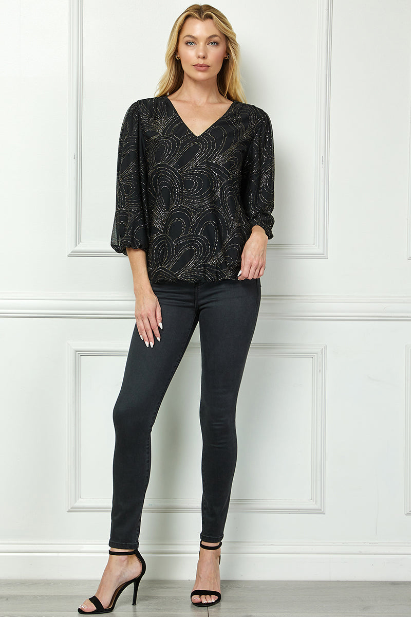 3/4 Puff Sleeve V-Neck Bubble Blouse in Black