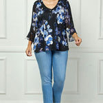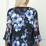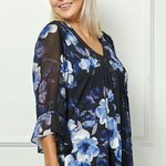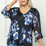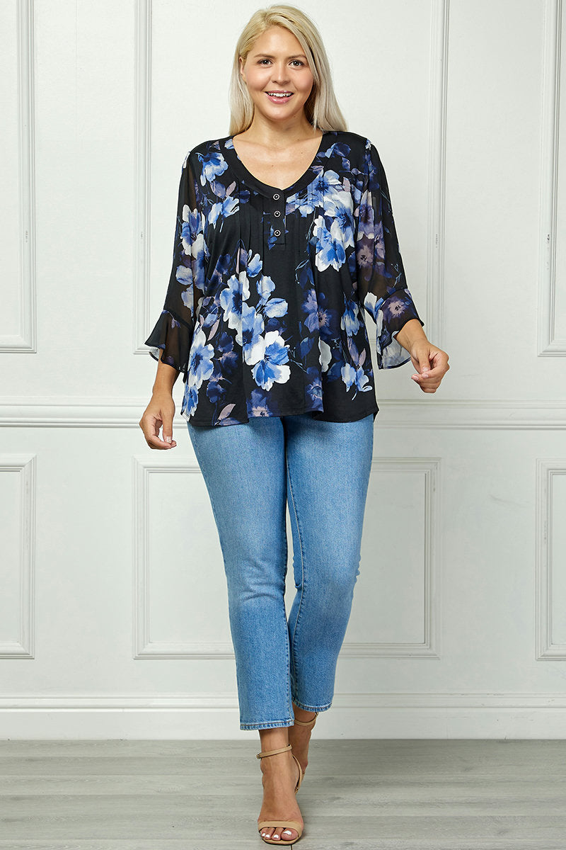 3/4 Ruffle Sleeve Pintuck V-Neck Popover Blouse in Blue - Plus