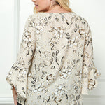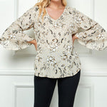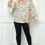 3/4 Ruffle Sleeve V-Neck Dash Foil Print Blouse in Beige - Plus