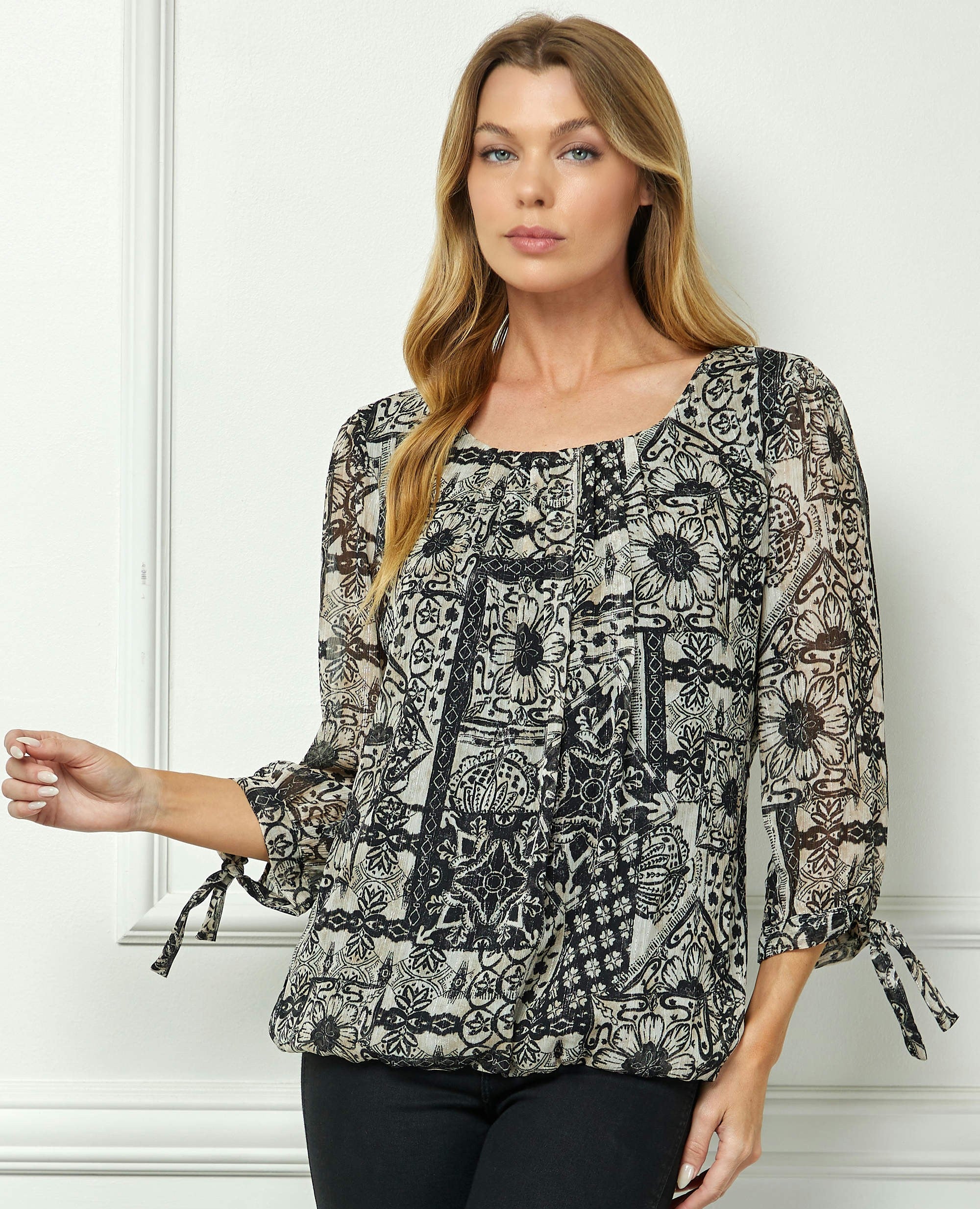 Refined yet effortlessly wearable, this blouse combines feminine details with a relaxed, flattering fit. The softly pleated neckline adds a touch of sophistication, while the tie-accented 3/4 sleeves lend a hint of charm and versatility.