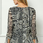 3/4 Tie Sleeve Pleat Neck Bubble Blouse in Black
